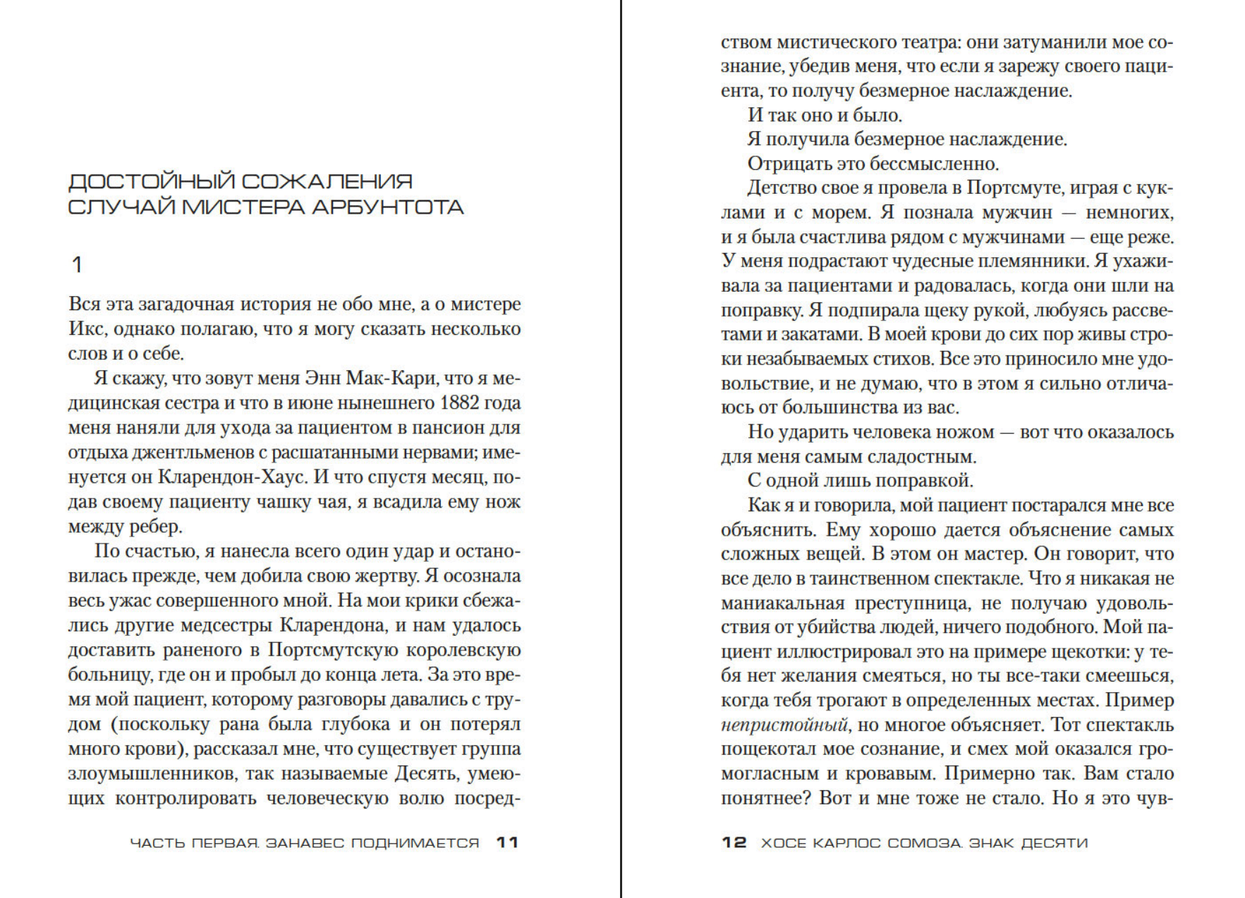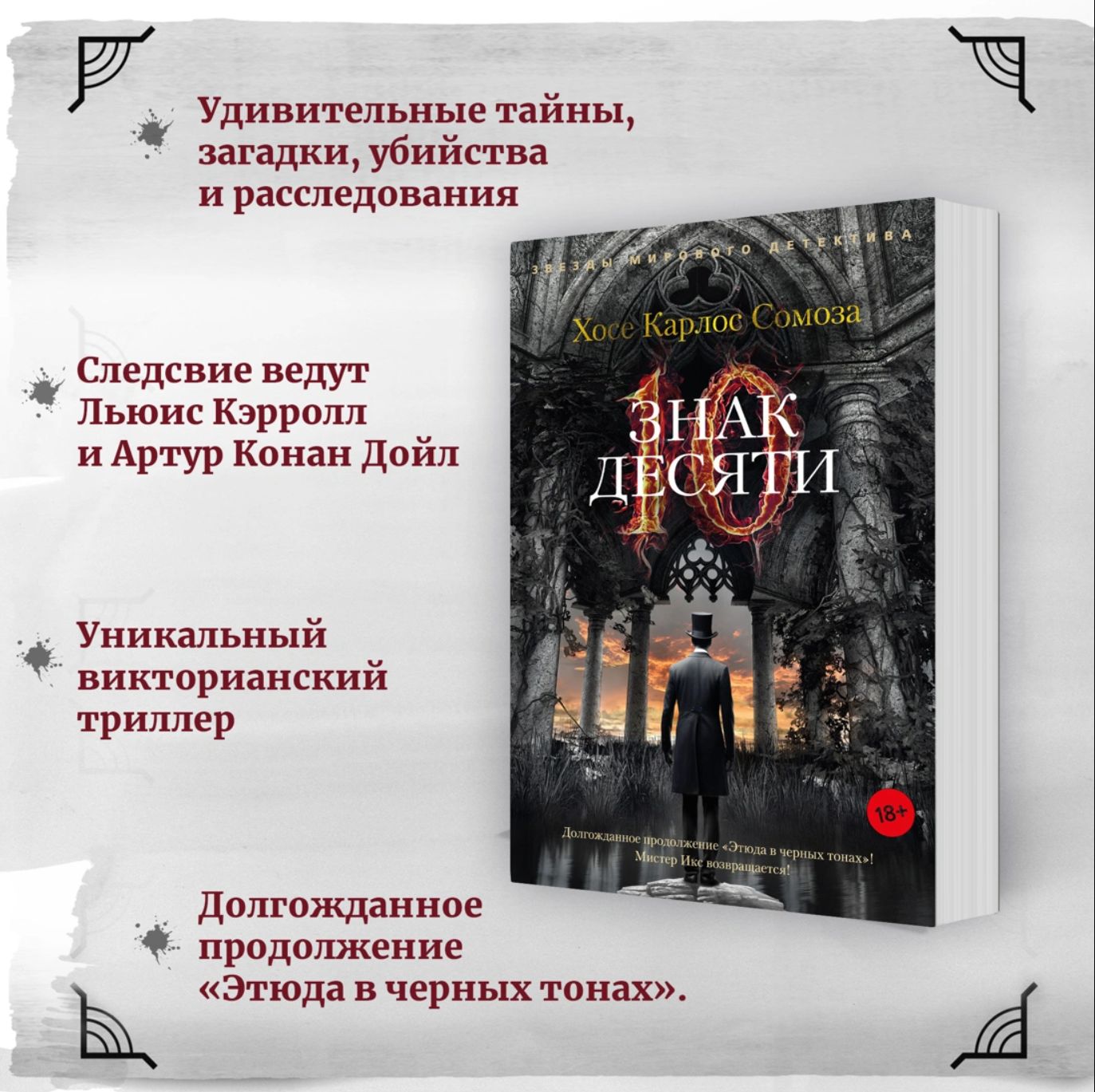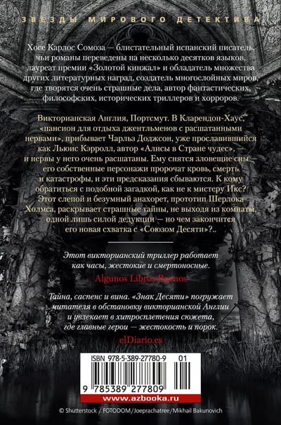 José Carlos Somoza is a brilliant Spanish writer whose novels have been translated into dozens of languages. He is a winner of the Golden Dagger Award and numerous other literary awards, a creator of multilayered worlds where terrifying things happen, and the author of science fiction, philosophical, and historical thrillers and horror novels. In "The Sign of Ten," a sequel to "A Study in Black," the infernally perceptive Mr. X and his loyal, ironic, strong, and sensitive nurse, Anne McCarthy, return. Along with them, actors, prop masters, and audience members of brutal underground theaters, renowned psychiatrists, and, of course, Arthur Conan Doyle, are entangled in an unpredictable plot.