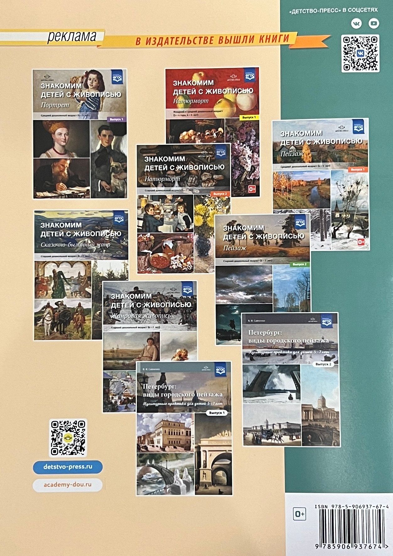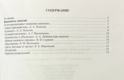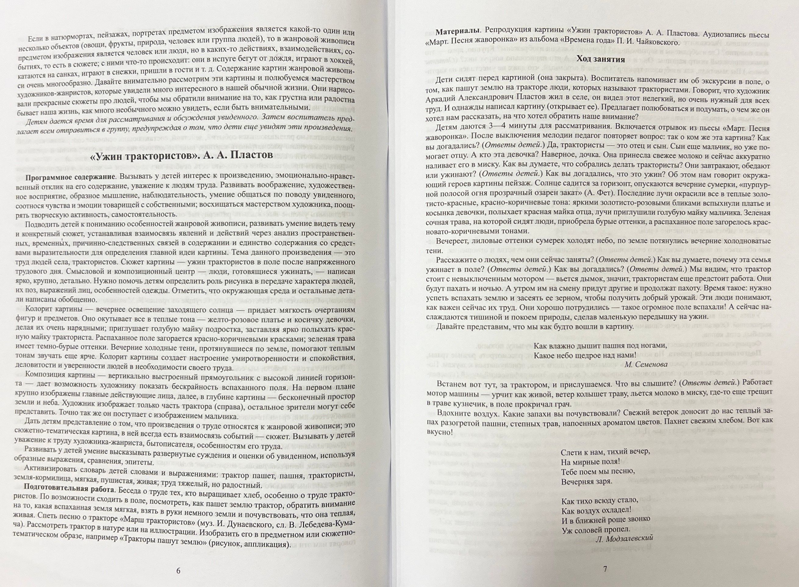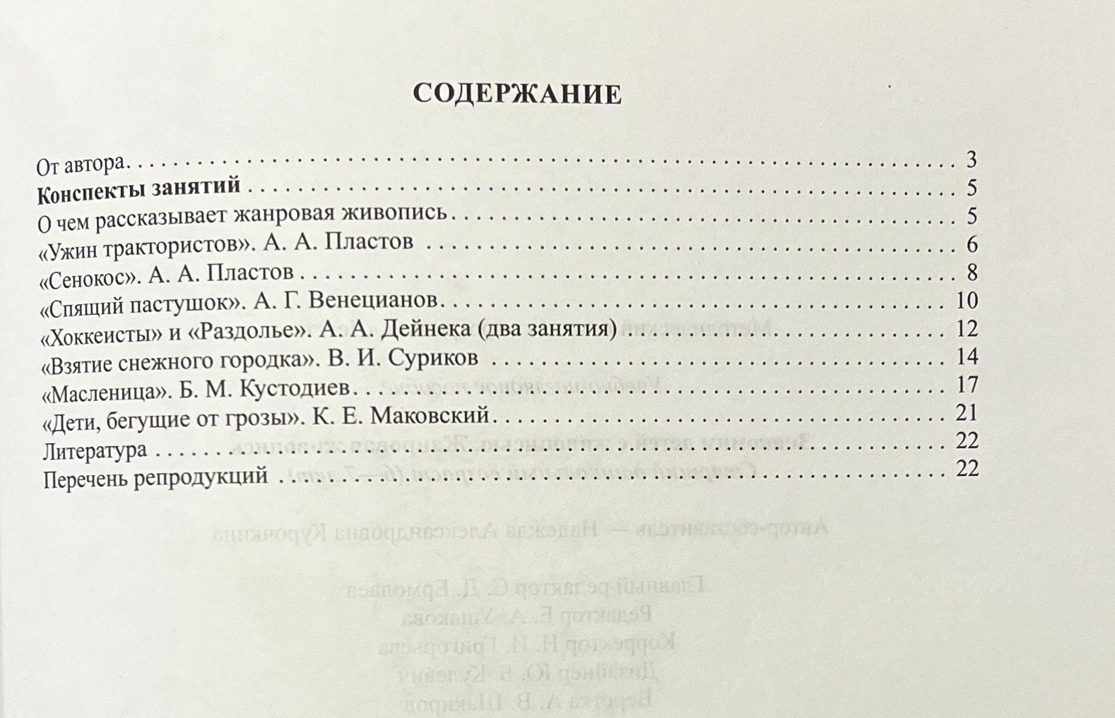 The manual presents the methodology of pedagogical work to familiarize children of senior preschool age with genre painting, it also includes a selection of color reproductions of famous artists. There are sample outlines for familiarizing children aged 6-7 with genre painting on the themes of labor, sports, traditional holidays and games, everyday life. The teacher, based on his goals, can use the developed outlines, making their own additions, changes, or pick up reproductions of other paintings on these topics.