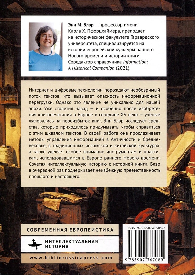 The Internet and digital technologies generate an immense flow of texts, which causes the danger of information overload. However, this phenomenon is not unique to our era. Centuries ago - and especially after the invention of printing in Europe in the mid-fifteenth century - scholars complained about the overabundance of books. Anne Blair explores the means that had to be devised to cope with this barrage of texts. Her work traces information management techniques in Antiquity and the Middle Ages, in traditional Islamic and Chinese cultures, and focuses on the tools and practices used in early Modern Europe. Combining intellectual history with the history of the book, Blair once again emphasizes the inevitable continuity of past and present.