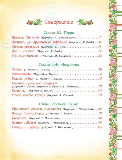 The collection includes the most famous and favorite works of the great storytellers in full classical translation: Charles Perrault, Hans Christian Andersen and the Brothers Grimm, which for several centuries have been read and read with constant pleasure by children all over the world. But, as before, these fairy tales remain the favorites of young readers.