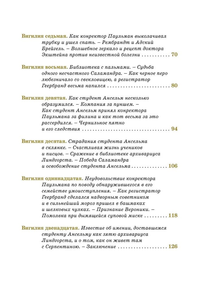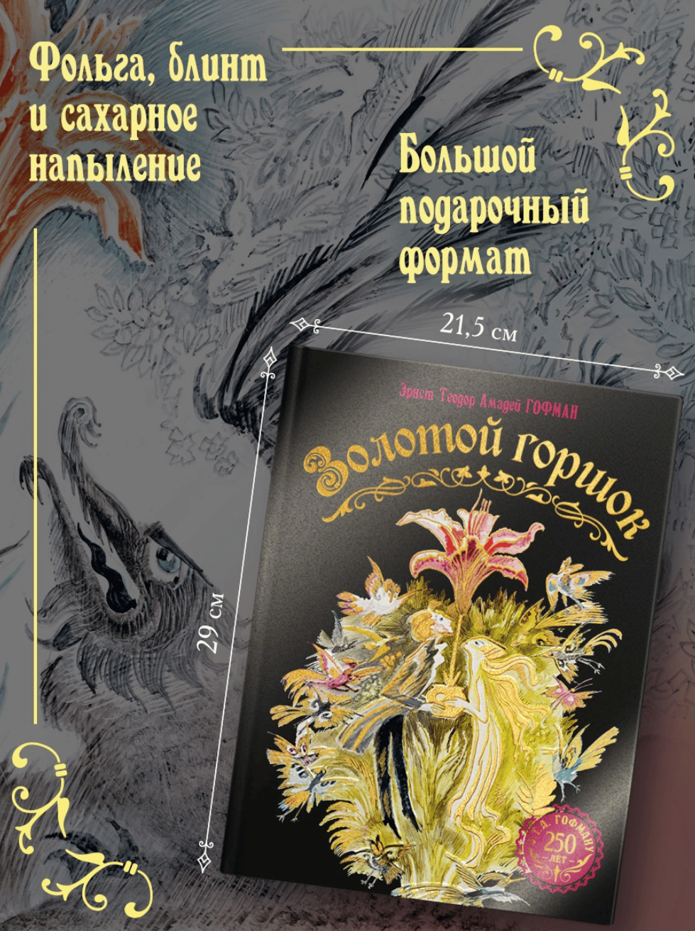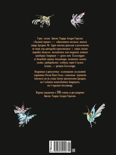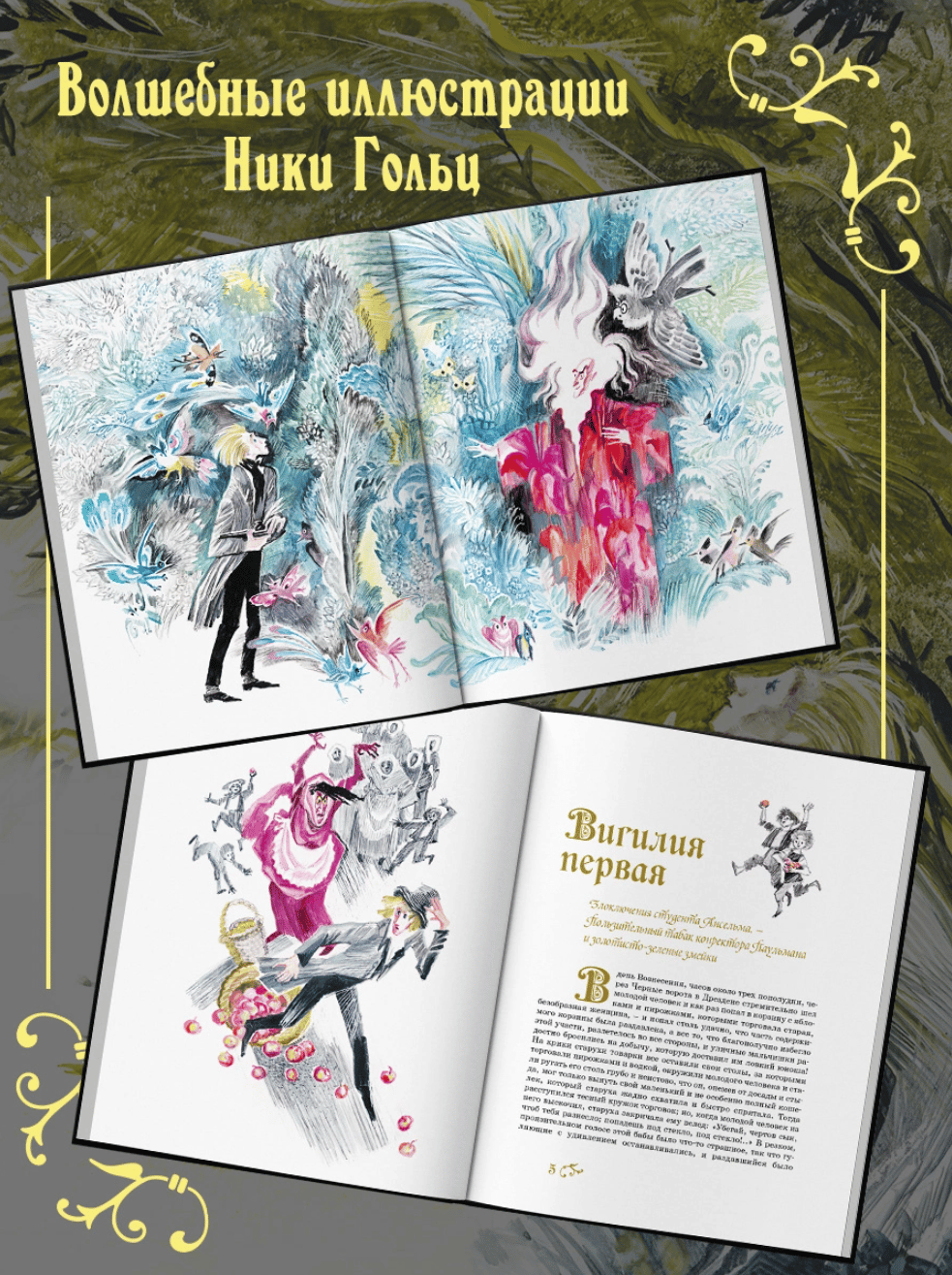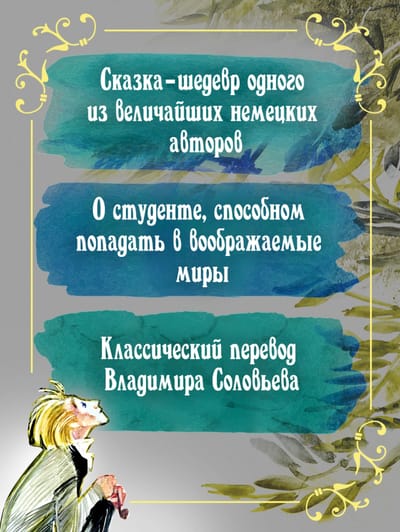 The heroes of Ernst Theodor Amadeus Hoffmann's fairy tale "The Golden Pot" are the writer's contemporaries, residents of Dresden. Their everyday lives are described in detail and realistically, but this world is intricately intertwined with the world of poetry: the apple seller turns out to be an evil sorceress, the secret archivist Lindhorst is the fire spirit Salamander from the magical land of Atlantis, and the golden-green snake that the protagonist sees in the elderberry bushes is Salamander's daughter. The airy and dynamic illustrations by the honored artist of Russia, Nika Golts, transport the reader from the streets of a rather prosaic Dresden to the office of the mysterious Lindhorst, and to the wondrous land of Atlantis.