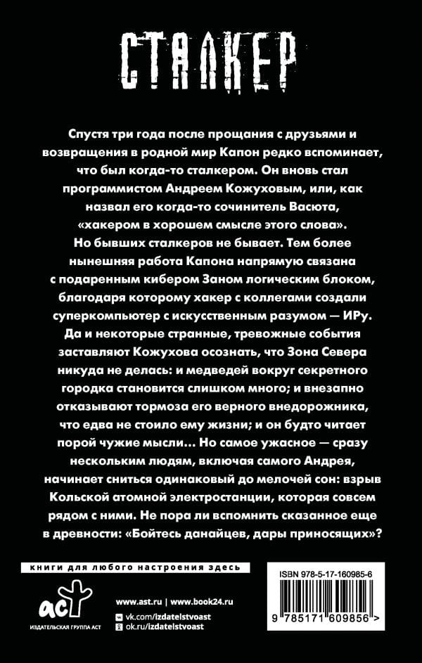 But there are no former stalkers. Especially the current work of Kapon is directly related to a gift cyber Zan logic block, thanks to which the hacker and his colleagues created a supercomputer with artificial intelligence - IRU. And some strange, disturbing events make Kozhukhov realize that the Zone of the North has not gone anywhere: and bears around the secret town becomes too many; and suddenly fail the brakes of his trusty SUV, which almost cost him his life; and he seems to read other people's thoughts.... But the worst thing is that several people at once, including Andrei himself, begin to dream the same dream: the explosion of the Kola nuclear power plant, which is very close to them. Isn't it time to remember what was said in ancient times: "Fear the Danites who bring gifts"?