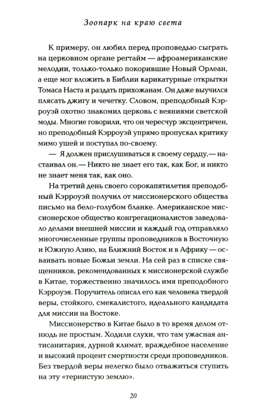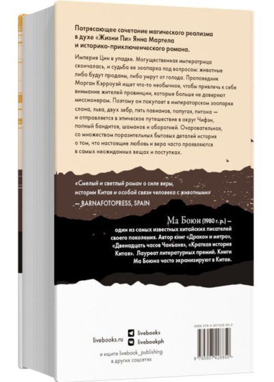 A stunning blend of magical realism in the vein of Yann Martel's Life of Pi and historical adventure novels. The Qing Empire is in decline. The powerful empress has died, and the fate of her zoo is in doubt: the animals will either be sold or starve to death. Preacher Morgan Carroway seeks something unusual to attract the attention of provincial residents who no longer trust missionaries. So he purchases an elephant, a lion, two zebras, five baboons, a parrot, and a python from the imperial zoo—and sets off on an epic journey to Chifeng County, teeming with bandits, shamans, and werewolves. A charming story, rich in striking everyday details, about how true love and faith often manifest in the most unexpected things and actions.