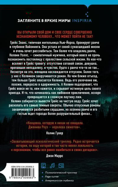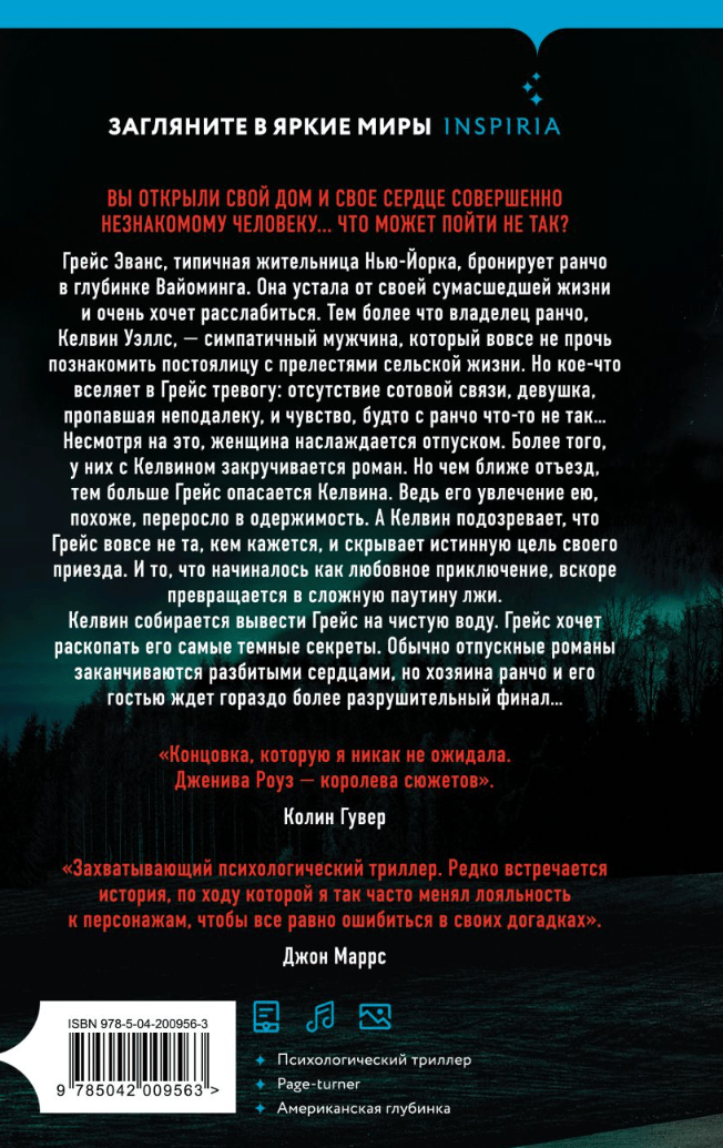 Grace Evans, a typical New Yorker, is booking a ranch in outback Wyoming. She is tired of her crazy life and wants to relax. Especially since the owner of the ranch, Calvin Wells, a handsome man who does not mind acquainting the guest with the charms of rural life. But something alarms Grace: a lack of cell phone service, a girl missing nearby, and the feeling that something is wrong with the ranch.