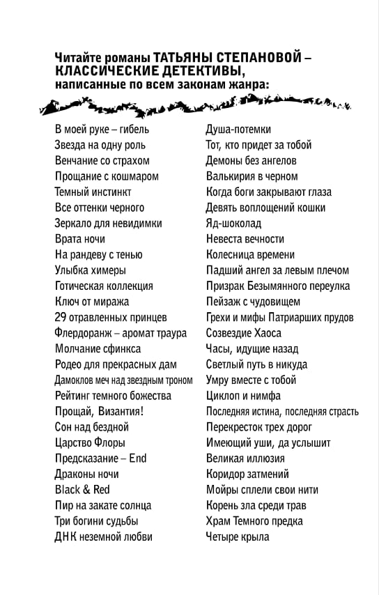 The novels of hereditary investigator Tatyana Stepanova allow the reader to experience a literary "haunted house." Mysterious murders, the almost tangible atmosphere of the crime, the agonizing and anxious anticipation of something unknown and terrifying... Tatyana Stepanova manages to convey all of this brilliantly. Chance encounters, everyday affairs, and insignificant details are depicted in her detective stories in a special, dramatic light, like a harmless spring meadow before a rapidly approaching thunderstorm.