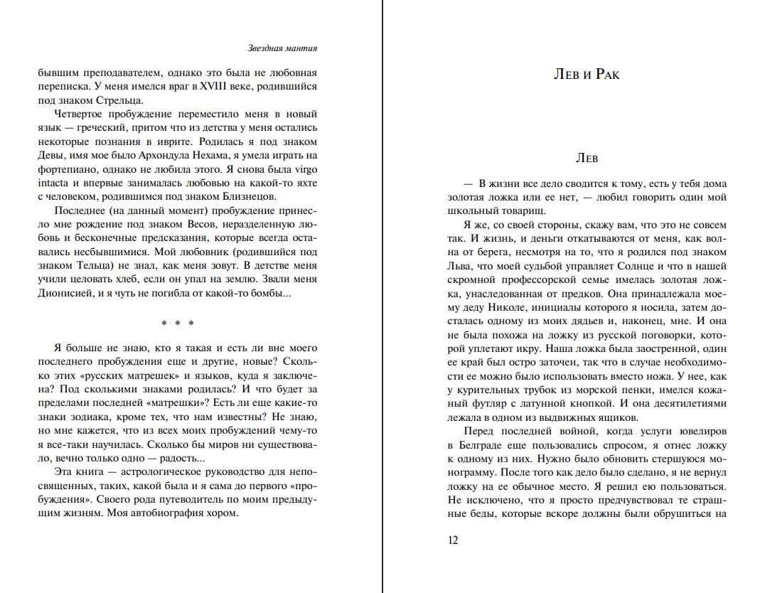"Starry Mantle" is a guide to the signs of the zodiac. The protagonist discovers that whenever she falls asleep, she is reborn under a different sign. She becomes a medieval woman in love with an Aquarius man and planning to kill someone. She awakens as a woman from the 20th century who has an 18th-century enemy, born under the sign of Sagittarius, who is stealing her time and youth. She finds herself under bombardment in Yugoslavia, suffering from love for a Taurus who has forgotten her name...