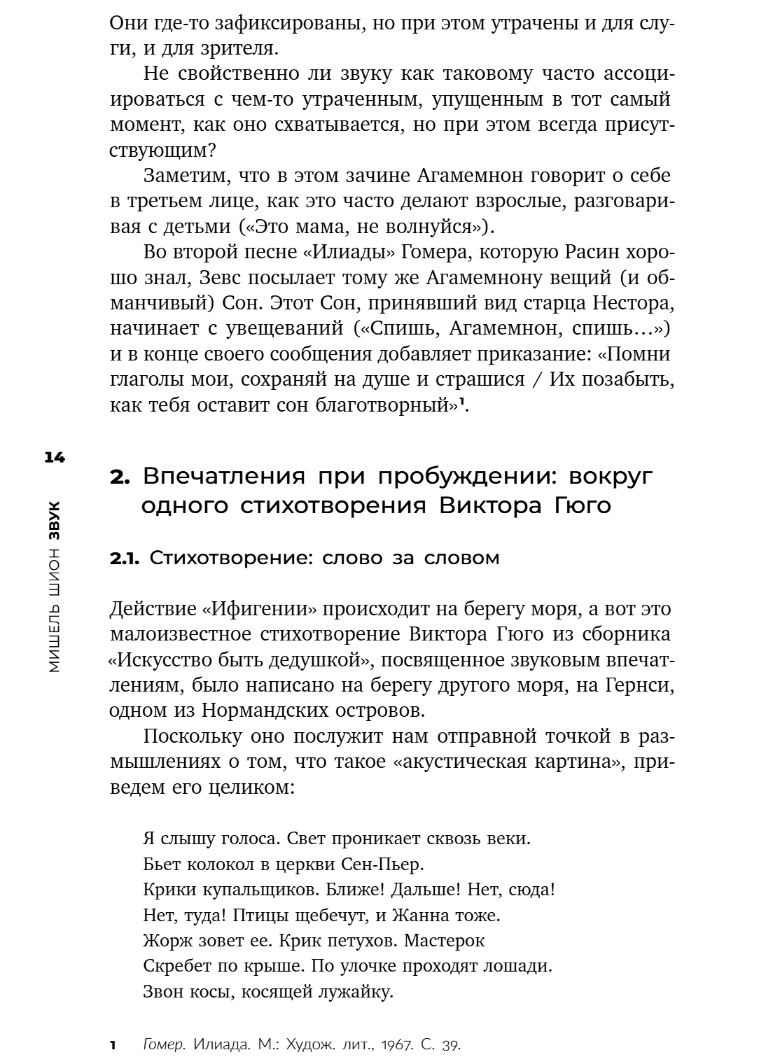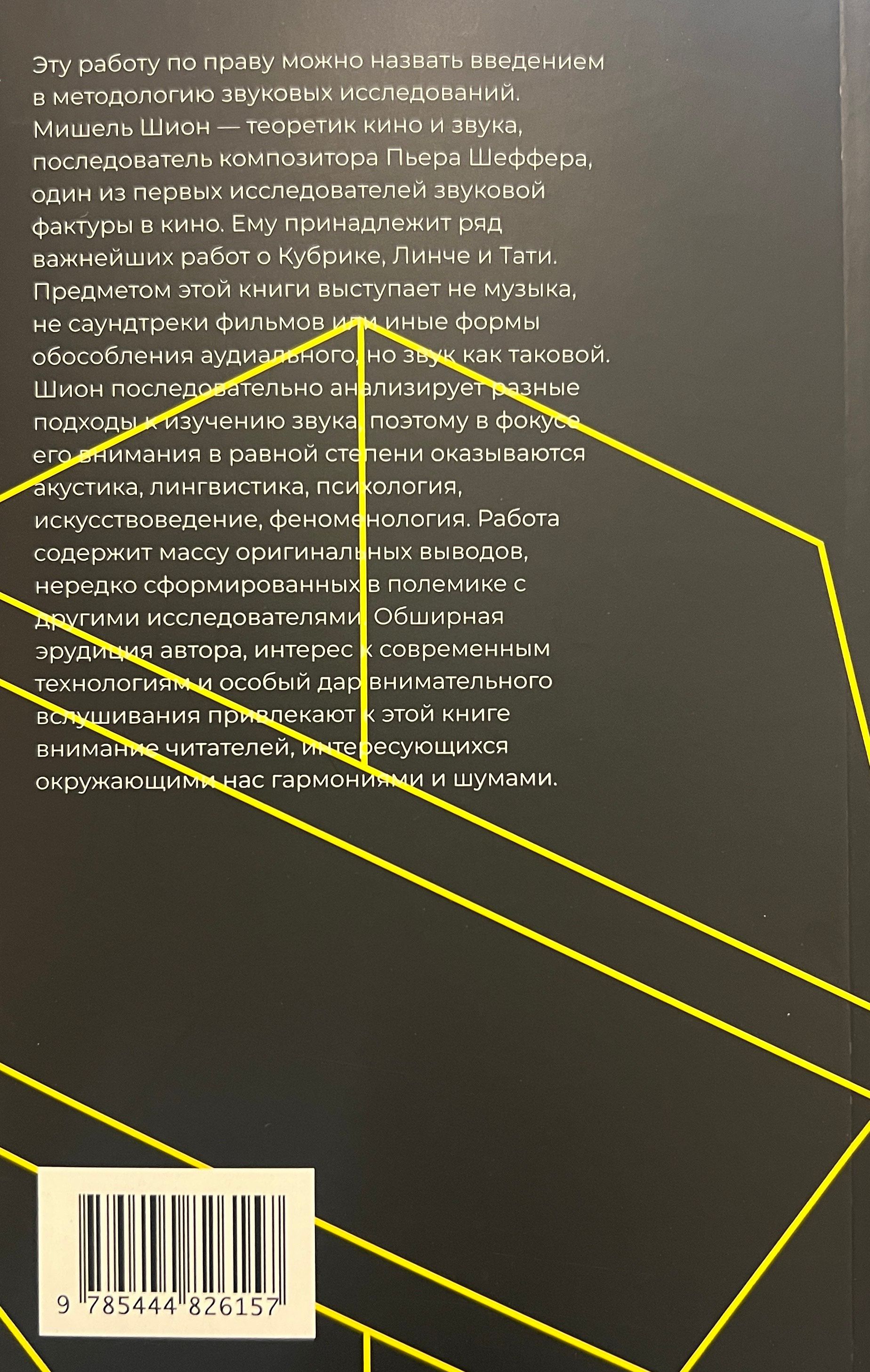 This work can rightly be called an introduction to the methodology of sound studies. Michel Chion is a theorist of cinema and sound, a follower of the composer Pierre Schaeffer, one of the first researchers of sound texture in cinema. He is the author of a number of important works on Kubrick, Lynch and Tati. The subject of this book is not music, not film soundtracks or other forms of isolating the auditory, but sound as such. Chion consistently analyzes different approaches to the study of sound, so his focus is equally on acoustics, linguistics, psychology, art history, phenomenology. The work contains a lot of original conclusions, often formed in polemics with other researchers. The author's extensive erudition, interest in modern technologies and a special gift for attentive listening attract the attention of readers interested in the harmonies and noises that surround us.