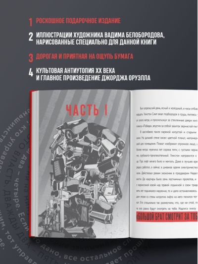 Šī ikoniskā 20. gadsimta distopija un Džordža Orvela magnum opus tiek atdzīvināta ar jaunām ilustrācijām, ko mākslinieks Vadims Beloborodovs radījis speciāli šim izdevumam. Grāmatas izkārtojums nemanāmi papildina ilustrācijas: skaists, vienkāršs un skarbs, tāpat kā pats romāns.