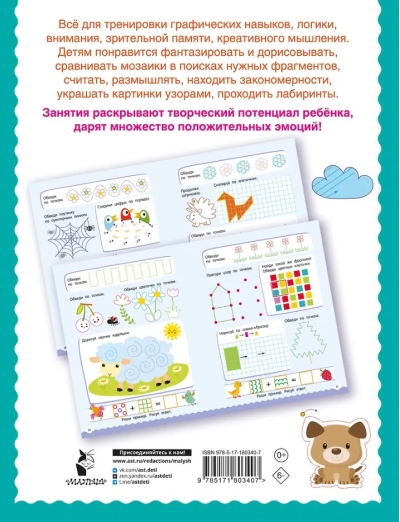 Daudz, daudz grafisku mīklu, krāsojamo lapu, skaitļu spēļu, "atrodi pats" spēļu, loģikas un atjautības izaicinājumu. Aiciniet savu jautrības grupu iztēloties un pabeigt zīmējumus, salīdzināt mozaīkas, lai atrastu pareizās daļas, skaitīt, domāt, atrast rakstus, kopēt pa kvadrātiem un punktiem, izrotāt attēlus ar rakstiem, risināt labirintus — šīs intelektuālās aktivitātes paplašina redzesloku un vārdu krājumu, attīsta grafiskās prasmes un attīsta domāšanu, atmiņu, uzmanību, novērošanu, atjautību un radošumu. Kad bērns atvērs pirmo lappusi, viņš to vairs nevarēs nolikt malā!