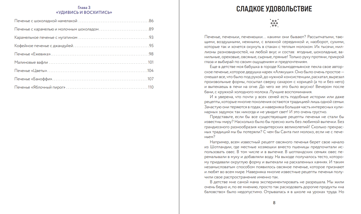 Starptautiski atzīta konditore un populārā blogere Ņina Tarasova ir sarakstījusi grāmatu, kurā noteikti atradīsiet cepumu recepti, kas kļūs par jūsu iecienītāko. Grāmatai ir trīs nodaļas: pirmajā un garākajā nodaļā piedāvāti vienkārši, firmas cepumi. Šīs sadaļas receptes ir ideāli piemērotas gatavošanai kopā ar bērniem. Otrā nodaļa ir veltīta sāļajiem uzkodu cepumiem. Trešajā nodaļā tiek pētīta augstā un elegantā konditorejas māksla.