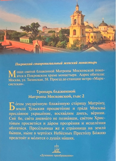Brošūrā ir attēlots akatiķis Svētajai Svētītajai Maskavas Matronai, kas iespiests lielā civilā fontā.