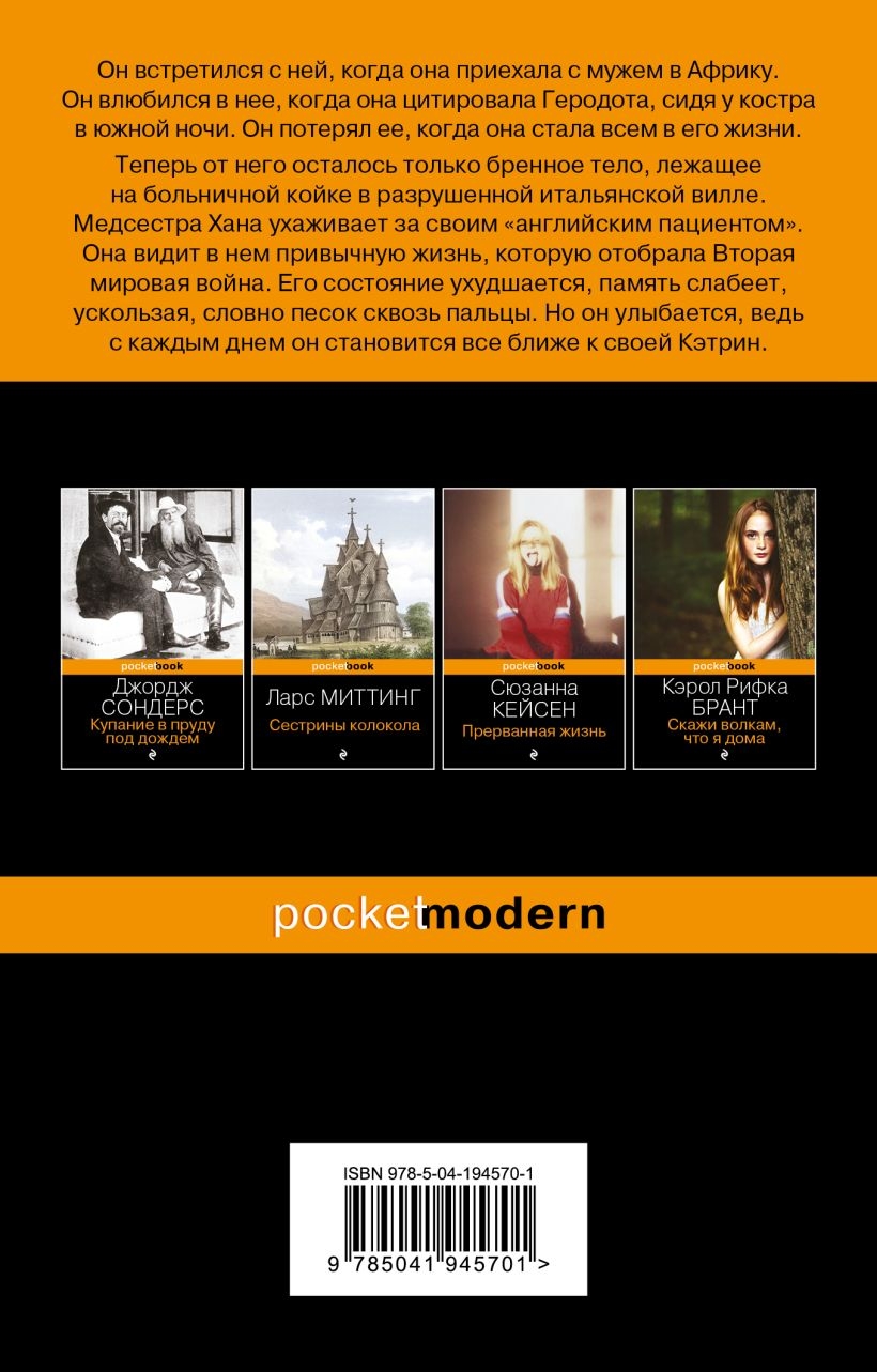 Tagad viss, kas no viņa ir palicis, ir viņa mirstīgais ķermenis, kas guļ slimnīcas gultā sagrautajā Itālijas villā. Medmāsa Hana brīvprātīgi piesakās rūpēties par savu "angļu pacientu". Viņa viņā saskata pazīstamu dzīvi, ko atņēma Otrais pasaules karš. Viņa stāvoklis pasliktinās, atmiņa vājinās, slīdot caur pirkstiem kā smiltis. Bet viņš smaida, jo ar katru dienu viņš kļūst arvien tuvāks savai Katrīnai.
