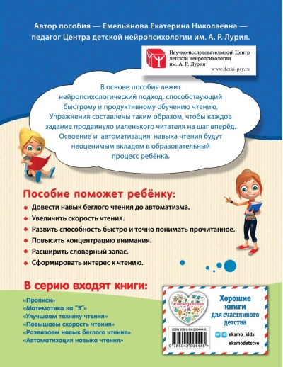 Šī grāmata, kuras autore ir E. N. Jemeļjanova, praktizējoša skolotāja un neiropsiholoģe A. R. Lurijas Bērnu neiropsiholoģijas centrā un atzīta eksperte šajā jomā, ir balstīta uz neiropsiholoģisku pieeju, kas veicina ātru un efektīvu lasīšanas apmācību. Izglītojošās aktivitātes ir veidotas tā, lai katrs vingrinājums jaunajam lasītājam sniegtu soli tālāk. Lai sasniegtu pamanāmus un ilgstošus rezultātus, būs nepieciešama pieaugušo palīdzība; bērnam jāpārskata aktivitātes kopā ar bērnu un jāuzrauga to izpilde. Lasīšanas prasmes apgūšana un automatizācija būs nenovērtējams ieguldījums bērna izglītībā un ļaus viņam realizēt savus iedzimtos talantus.