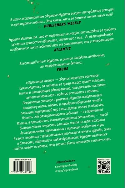 "Dzīves ceremonija" ir Sajakas Muratas īso stāstu krājums, kuras proza Japānā ir augsti novērtēta. Vienlaikus mīļi un šokējoši, tie pārsteidz lasītāju un paliks atmiņā.