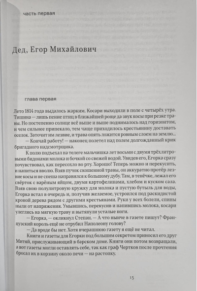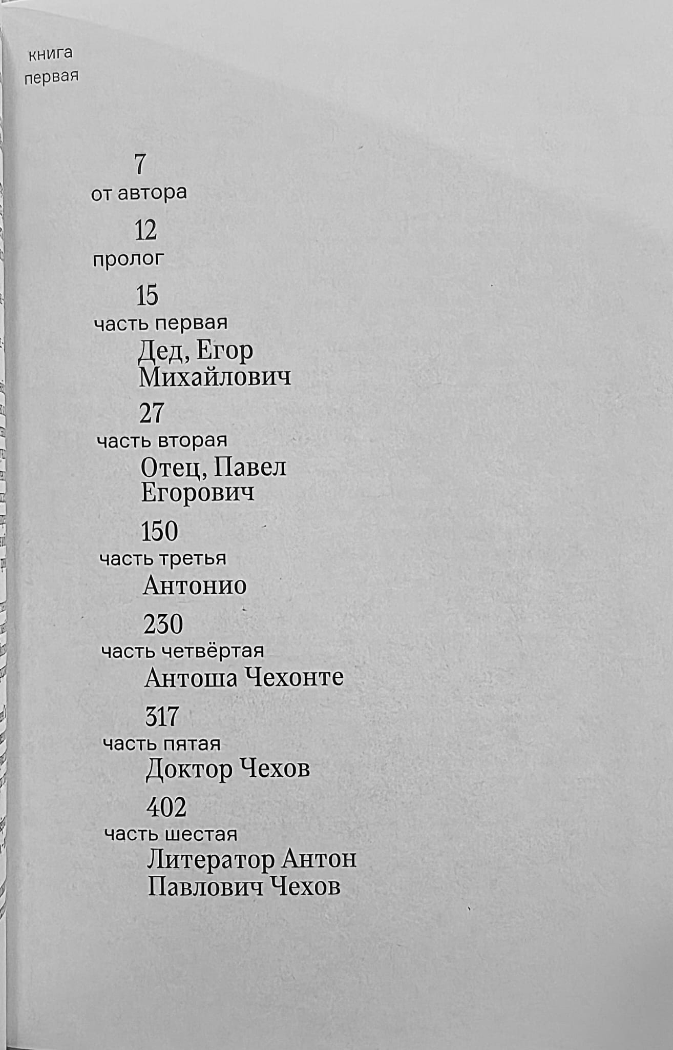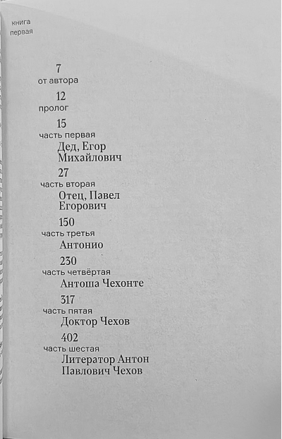 Pirmā grāmata ir veltīta Čehovu ģimenes dibinātājiem, kuri nāca no dzimtbūšanas, kā arī paša Antona Pavloviča, viņa brāļu un māsas bērnībai un pusaudža gadiem un viņu ienākšanai pieaugušo dzīvē.