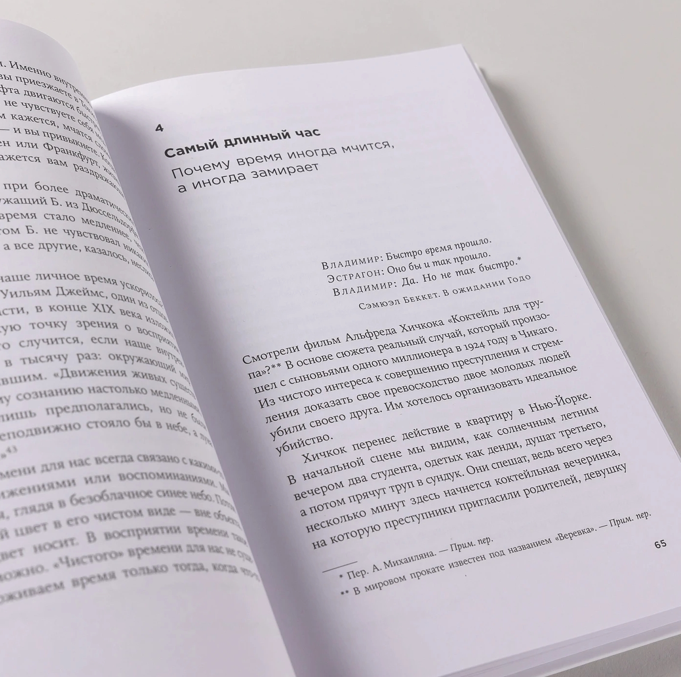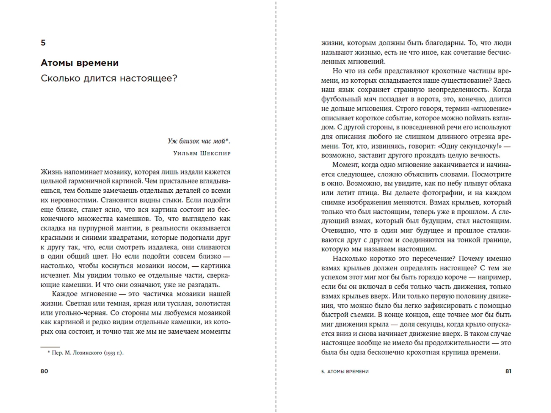 Izrādās, ka mūsu iekšējais pulkstenis darbojas pavisam citādi nekā ārējais. Tāpēc laimīgie brīži paskrien vēja spārniem, bet nepatīkamie velkas kā stundas. Autors skaidro, kāpēc nogurums liek mums zaudēt mirkļa izjūtu, no kurienes rodas pastāvīgā steiga un kāpēc gadi, mums novecojot, šķiet, rit ātrāk.