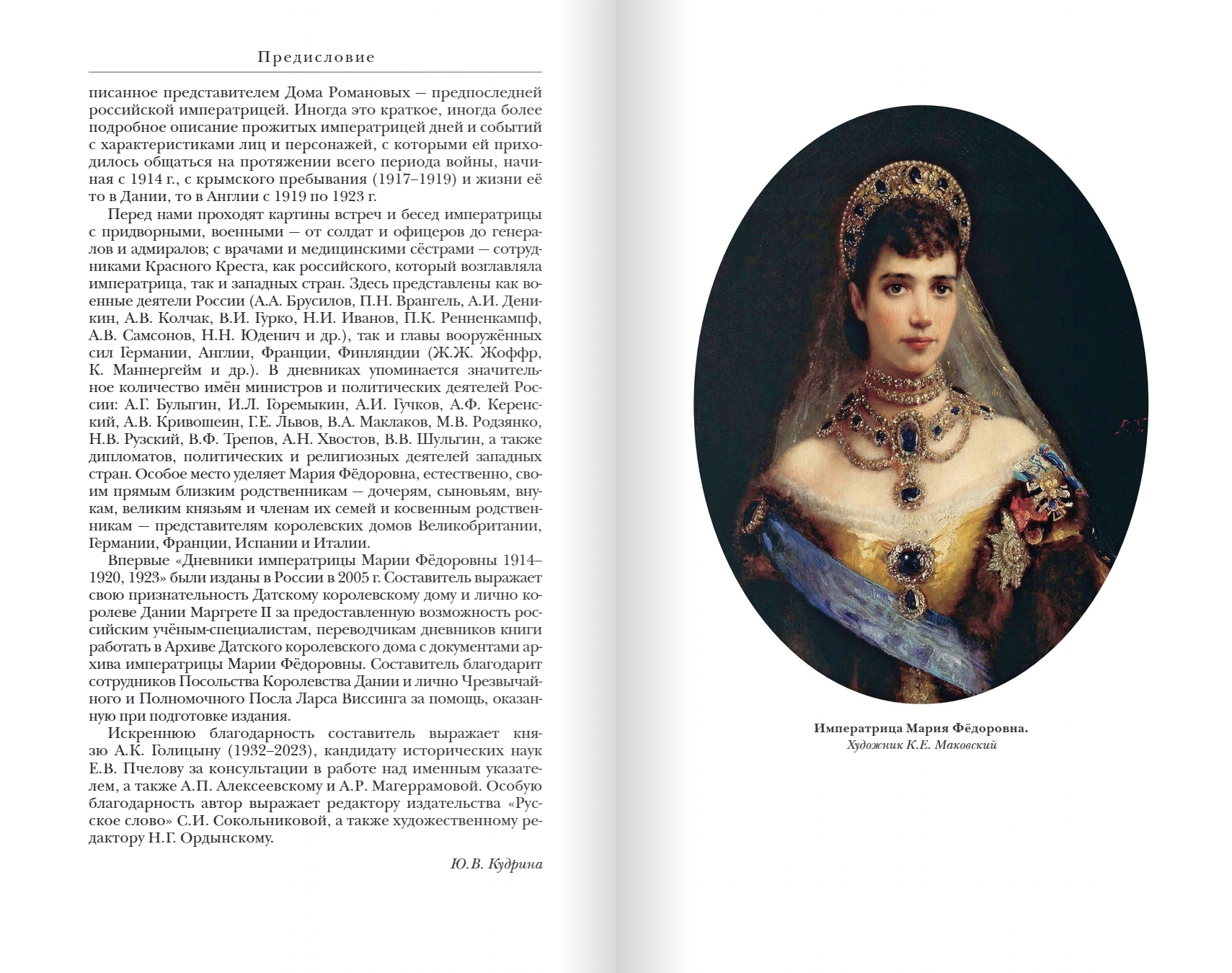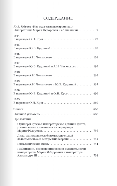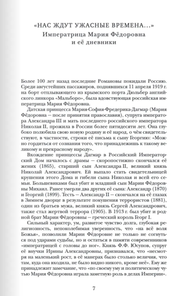 Krievijas imperatores Marijas Feodorovnas (1847–1928) dienasgrāmatas satur dokumentārus pierādījumus par 20. gadsimta pirmās trešdaļas pagrieziena punktu, kas ietvēra Pirmā pasaules kara un Krievijas revolūcijas gadus. Dānijas princese Marija Sofija Frederika Dagmāra (Marija Feodorovna pēc pievēršanās pareizticībai), imperatora Aleksandra III sieva un pēdējā Krievijas imperatora Nikolaja II māte, dzīvoja Krievijā vairāk nekā piecdesmit gadus. Viņa dziļi mīlēja savu jauno dzimteni un tās iedzīvotājus: "Var lepoties ar apziņu, ka pieder tik diženai un brīnišķīgai tautai." Viņa bija lieciniece Romanovu imperatora nama sabrukumam un sava dēla Nikolaja un visas viņa ģimenes nāvei. Viņa nebaidījās no likteņa triecieniem un laikabiedru atmiņā palika kā "ķeizariene no galvas līdz kājām".