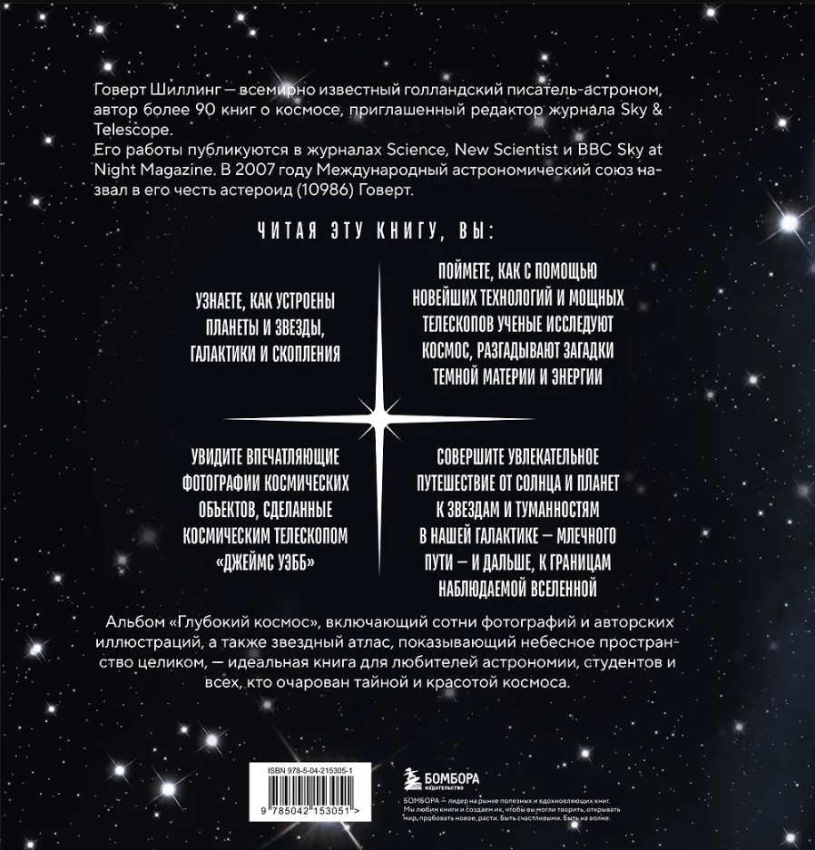 “Deep Space” ir unikāls ilustrēts izdevums ikvienam, kurš vēlas izprast kosmosu, izmantojot aizraujošas fotogrāfijas un skaidrus skaidrojumus. Šī ir vairāk nekā tikai grāmata — tas ir aizraujošs ceļojums no Saules sistēmas līdz novērojamā Visuma tālākajiem nostūriem, atklājot zvaigžņu dzimšanas un nāves noslēpumus, galaktiku uzbūvi, supermasīvo melno caurumu vēsturi, tumšo matēriju un enerģiju. Ar simtiem spilgtu attēlu, tostarp jauniem attēliem no Džeimsa Veba kosmiskā teleskopa, un zvaigžņu atlantu patstāvīgai novērošanai, šī grāmata būs vērtīga un iedvesmojoša dāvana ikvienam, kas interesējas par astronomiju un kosmosu.