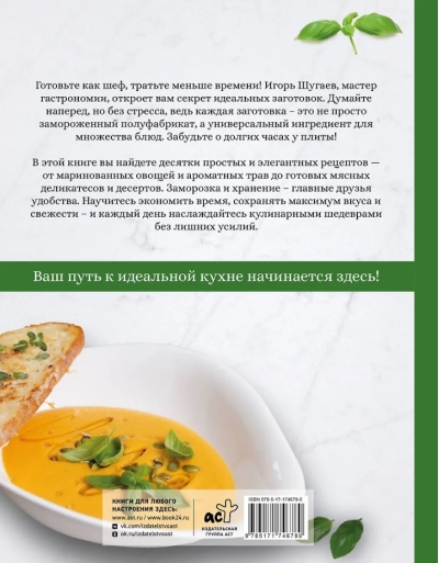 Gatavo kā šefpavārs, tikai velti mazāk laika! Igors Šugajevs, gastronomijas meistars, atklās perfektas pagatavošanas noslēpumu. Domā uz priekšu, bet bez stresa, jo katrs ēdiens ir vairāk nekā tikai saldēts, gatavošanas gatavošanas gatavošanas produkts, bet gan daudzpusīga sastāvdaļa daudziem ēdieniem. Aizmirstiet par ilgām stundām pie plīts! Šajā grāmatā atradīsiet desmitiem vienkāršu un elegantu recepšu — sākot no marinētiem dārzeņiem un aromātiskiem garšaugiem līdz gatavai gaļai un desertiem. Saldēšana un uzglabāšana: ērtības labākais draugs. Iemācieties ietaupīt laiku, saglabāt maksimālu garšu un svaigumu un baudīt kulinārijas šedevrus katru dienu bez papildu piepūles. Jūsu ceļojums uz perfektu virtuvi sākas šeit!