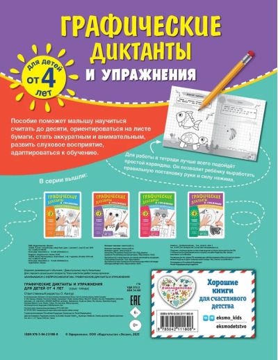 Šī grāmata no izdevniecības “Eksmo” palīdzēs jūsu bērnam iemācīties skaitīt līdz desmit, rakstīt skaitļus, orientēties papīra lapā, sadarboties ar pieaugušo, kurš diktē uzdevumu, un attīstīt dzirdes uztveri, smalko motoriku, telpisko un loģisko domāšanu. Grafiskie diktāti trenē uzmanību un māca bērniem precizitāti un pareizību zīmēšanā. Turklāt tas ir neticami aizraujoši un saistoši! Darba burtnīcas lapās ir lieli režģi, padarot uzdevumu pieejamu bērniem, kuri tikai sāk risināt grafiskus uzdevumus uz papīra. Vingrinājumi ir izstrādāti tā, lai pakāpeniski palielinātu grūtības pakāpi. Darbam ar darba burtnīcu vislabāk piemērots zīmulis. Tas palīdzēs jūsu bērnam attīstīt pareizu rokas pozicionēšanu un spiedienu. Šis resurss palīdzēs vecākiem produktīvi pavadīt brīvo laiku kopā ar savu bērnu, vienlaikus palīdzot jūsu bērnam kļūt uzmanīgākam, centīgākam un patstāvīgākam, kā arī viegli sagatavoties skolai.