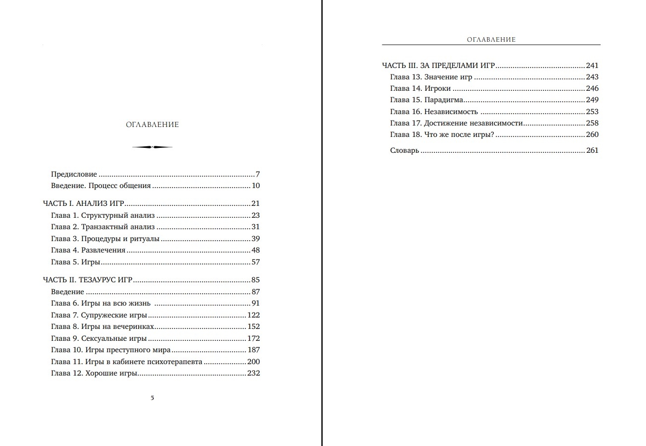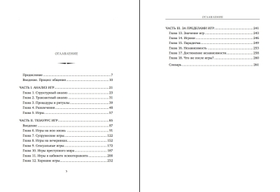 - Scenārijus spēlēm, kuras cilvēki neapzināti spēlē katru dienu. - Spēļu saskaņošanu ar dzīves situācijām, kurās tās tiek spēlētas. - Pretspēlēm vērstas stratēģijas, kas var palīdzēt atbrīvoties no ierastas uzvedības.