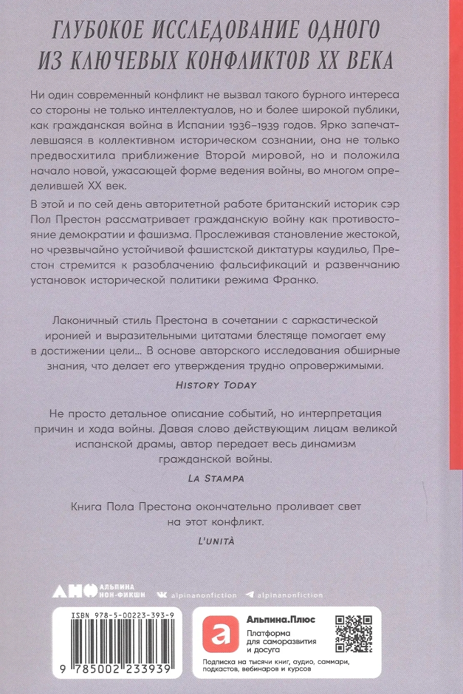 Dziļš pētījums par vienu no 20. gadsimta galvenajiem konfliktiem: nevis notikumu hronika, bet gan visaptveroša akadēmiska "kara biogrāfija". Autora mērķis ir izskaidrot, kāpēc Spānija 20. gadsimta 30. gados kļuva par šķiru, ideoloģisku un starptautisku konfliktu arēnu. Prestons parāda, kā politiskie spēki — no anarhistiem līdz monarhistiem — cīnījās par savu taisnīguma vīziju, kā un kāpēc nacistiskās Vācijas, fašistiskās Itālijas un citu valstu iejaukšanās pārvērta iekšzemes karu par Otrā pasaules kara prelūdiju un ģenerālmēģinājumu un iepriekš noteica tā formu. Kā veselu sociālo grupu iznīcināšana kļuva par šī kara jēgu un mērķi — un kā tālredzīgais Franko, veidojot savu pēckara Spānijas modeli, apzināti iznīcināja zaudētāju vēsturisko atmiņu. Autors atklāj dažādas "patiesības" un paskaidro, kāpēc karš, formāli beidzies, turpinās līdz pat šai dienai — un ir aktuāls daudz plašāk nekā tikai paši spāņi.