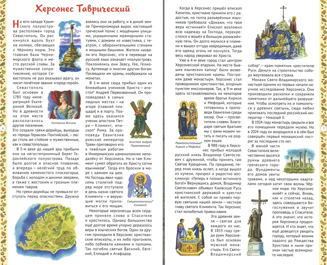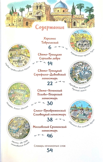 Šī krāsaini ilustrētā grāmata sniedz detalizētu un saistošu ievadu sešās Krievijas svētvietās. Tā palīdzēs bērniem izskaidrot svētceļojuma jēdzienu un iepazīstinās ar Hersonesas, Svētā Sergija Trīsvienības lauras, Divejevas klostera, Solovku, Pleskavas-Pečeru un Maskavas Sretenskas klosteru gadsimtiem seno vēsturi, arhitektūras pieminekļiem un svētvietām. Bērni uzzinās arī par daudziem Dieva svētajiem — sākot no kristietības agrīno gadsimtu svētajiem līdz pat 20. gadsimta jaunajiem mocekļiem un vecajiem.