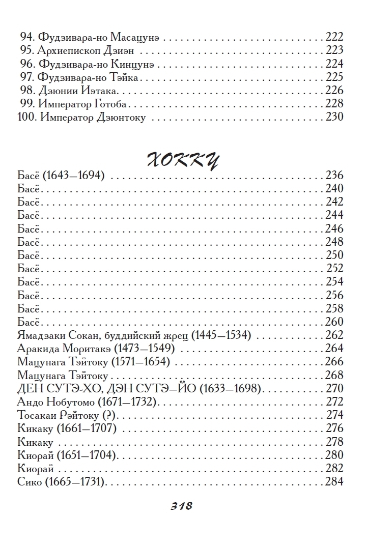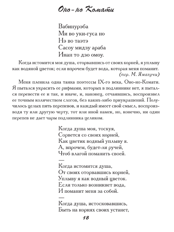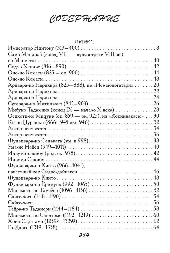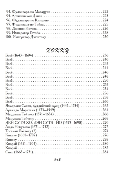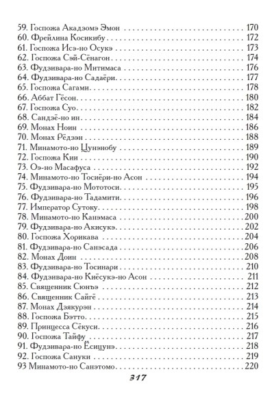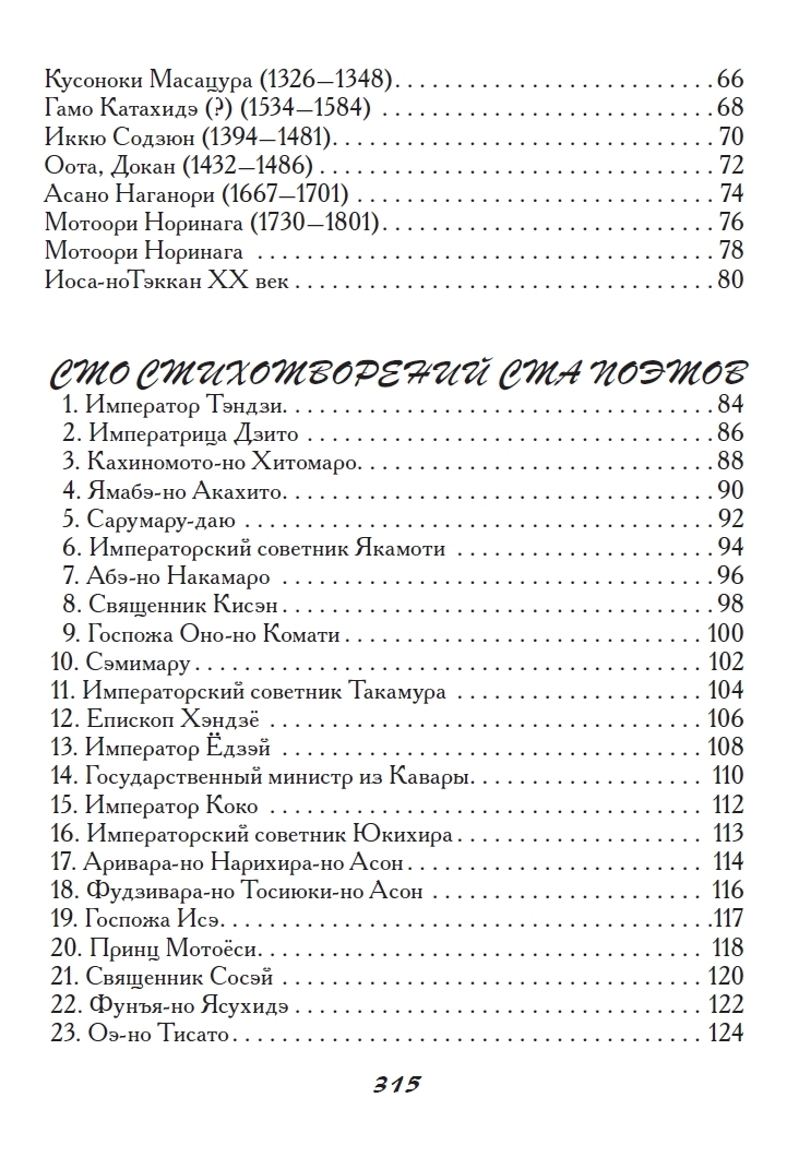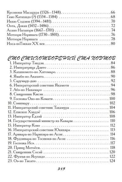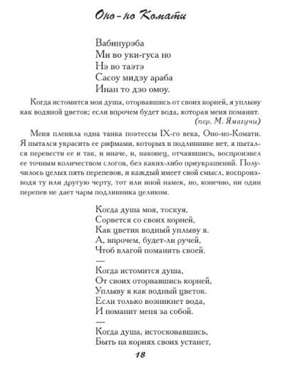 Šajā krājumā ir iekļautas tankas un haiku, ko sarakstījuši vairāk nekā 180 autori, tostarp tie, kuru darbi tika iekļauti slavenajā antoloģijā "Hyakunin Isshu". Antoloģija ir iekļauta pilnībā. Katra dzejoļa oriģināls ir sniegts krievu transkripcijā, kam seko viens vai vairāki tulkojumi ar komentāriem, sniedzot ieskatu gan autorā, gan apstākļos, kādos viņu rindas tika rakstītas. Gandrīz katrs dzejolis krājumā ir ilustrēts ar oriģinālu japāņu iespiedumu, padarot šo antoloģiju par patiesi unikālu publikāciju.