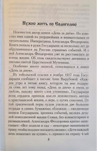 Lai gan 1908. gadā pirmo reizi izdotās grāmatas "Diena pa dienai" autors joprojām nav zināms, lasot to, rodas sajūta, ka runājat ar taisnīgu cilvēku, kura dzīve Dieva priekšā ir nevainojama. Tajā ir ietvertas pārdomas par kristīgo dzīvi un ceļu uz pestīšanu. Grāmatas vārdi ir piesātināti ar klusu ticības starojumu, kas noteikti atbalsosies pareizticīgo kristiešu sirdīs.