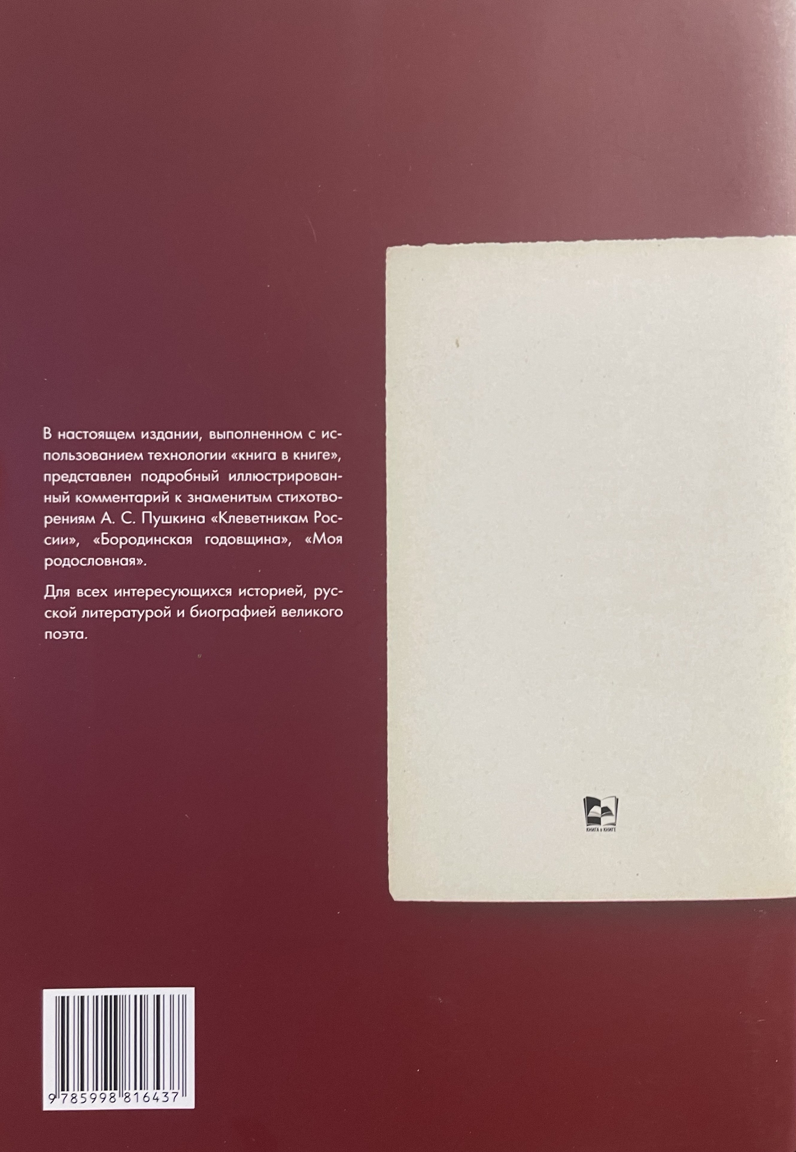 Šis grāmatas izdevums piedāvā detalizētus ilustrētus komentārus par A. S. Puškina slavenajiem dzejoļiem "Krievijas apmelotājiem", "Borodino gadadiena" un "Mana ģenealoģija". Tas ir ideāli piemērots ikvienam, kuru interesē dižā dzejnieka vēsture, krievu literatūra un biogrāfija.