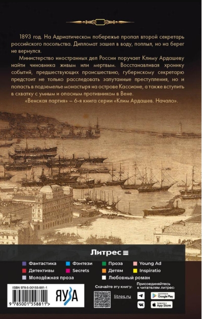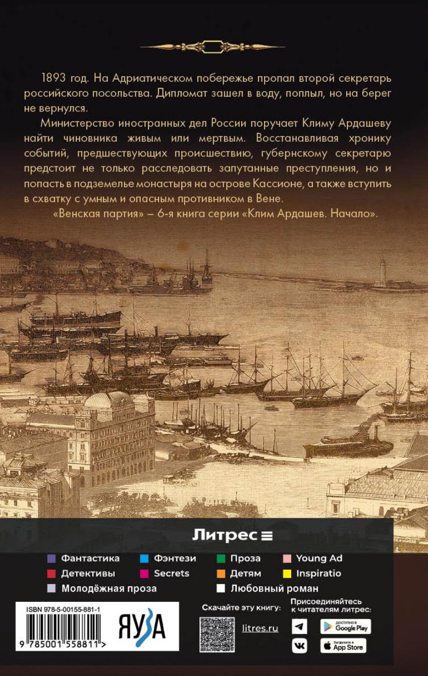 1893. gads. Krievijas vēstniecības otrais sekretārs pazuda Adrijas jūras piekrastē. Diplomāts iebrida ūdenī, peldēja, bet nekad neatgriezās krastā. Krievijas Ārlietu ministrija uzdod Klimam Ardaševam atrast amatpersonu dzīvu vai mirušu. Izsekojot notikumiem pirms incidenta, provinces sekretāram ne tikai jāizmeklē sarežģīti noziegumi, bet arī jāiekļūst Kasionas salas klostera pazemēs un jātiek galā ar viltīgu un bīstamu pretinieku Vīnē. "Vīnes ballīte" ir sestā grāmata sērijā "Klims Ardaševs: Sākums".