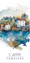 Naudas aploksne. Daudz laimes dzimšanas dienā. Akvareļa pilsēta.