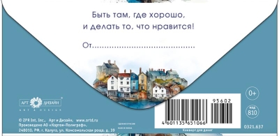 "Esi tur, kur jūties labi, un dari to, ko mīli!" Dāvanu aploksne ar tekstu aizmugurē.