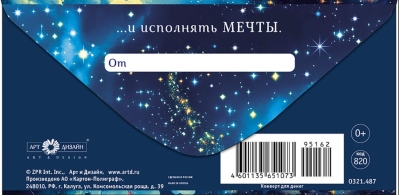 "...un piepildiet sapņus." Dāvanu aploksne ar tekstu aizmugurē.