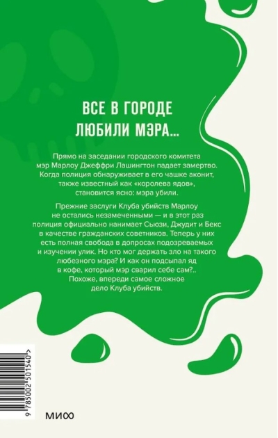 Mārlovas Slepkavību kluba iepriekšējie ziedojumi nav palikuši nepamanīti, un šoreiz policija oficiāli nolīgst Sjūziju, Džūditu un Beksu par pilsoņu padomniekiem. Tagad viņām ir pilnīga brīvība pratināt aizdomās turētos un pārbaudīt pierādījumus. Bet kurš gan varētu turēt ļaunu prātu pret tik laipnu mēru? Un kā vainīgais iemaisīja indi kafijā, ko mērs sev pagatavoja? Izskatās, ka Slepkavību kluba sarežģītākā lieta vēl tikai priekšā.