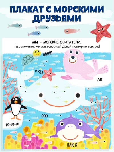 Jūs gaida jautri attēli, krāsains dizains, interaktīvi elementi un jautri, droši "kumsti". Un beigās ir plakāts ar visiem jūras draugiem.