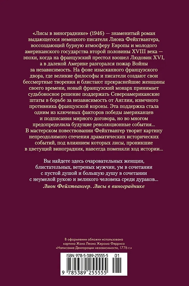 "Lapsas vīna dārzā" (1946) ir ievērojamā vācu rakstnieka Liona Feihtvangera slavenais romāns, kas atjauno Eiropas un jaunās Amerikas valsts nemierīgo atmosfēru 18. gadsimta otrajā pusē — laikmetā, kad Luijs XVI kāpa Francijas tronī un tālajā Amerikā plosījās Neatkarības karš. Uz izsmalcinātā Francijas galma fona, kur lieli filozofi un rakstnieki radīja savus nemirstīgos darbus un mirdzēja sava laika skaistākās sievietes, jaunais Francijas monarhs pieņēma liktenīgu lēmumu atbalstīt Ziemeļamerikas valstis to cīņā par neatkarību no Anglijas, Francijas kroņa mūžīgās pretinieces. Šis atbalsts kļuva par galveno faktoru Amerikas uzvarā un miera līguma parakstīšanā, bet daudzējādā ziņā noteica arī turpmākos revolucionāros notikumus...