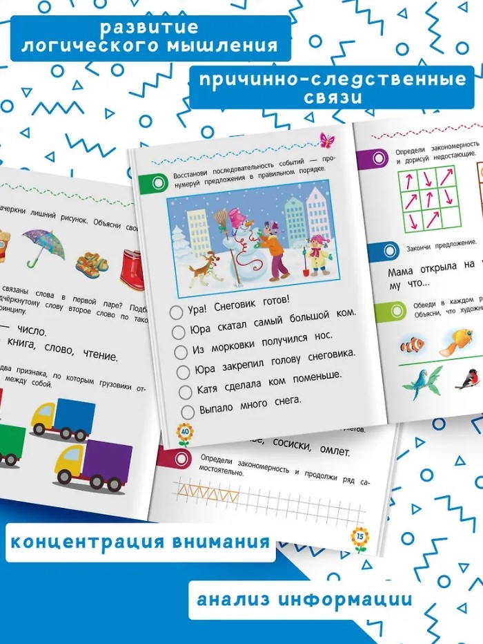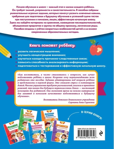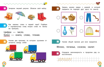 Iestāšanās pirmajā klasē ir izšķirošs pagrieziena punkts bērna dzīvē, un tai nepieciešama rūpīga sagatavošanās. Šis mācību līdzeklis ietver dažāda veida uzdevumus, kas paredzēti, lai novērtētu pamatprasmju un iemaņu apguvi, kas nepieciešamas tālākai mācībai. Šis resurss palīdz novērtēt topošā pirmklasnieka loģiskās domāšanas attīstību: vai viņš var noteikt secības un modeļus, izvēlēties vispārinošus vārdus, salīdzināt un grupēt objektus pēc noteiktām īpašībām, turpināt loģiskās secības un noteikt, ko mākslinieks uzzīmējis nepareizi? Mācību līdzeklī sniegtie uzdevumi palīdzēs novērtēt bērna spējas, noteikt veiksmes jomas un izcelt jomas, kurās viņam ir grūtības. Šī attīstošā grāmata no izdevniecības Eksmo ir noderīga meitenēm un zēniem vecumā no 5, 6 un 7 gadiem, gatavojoties skolai. Iesakām iegādāties arī šādus resursus: "Lasīšana", "Grafiskās prasmes", "Pirmā matemātika" un "Uzmanība un atmiņa".