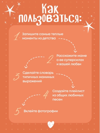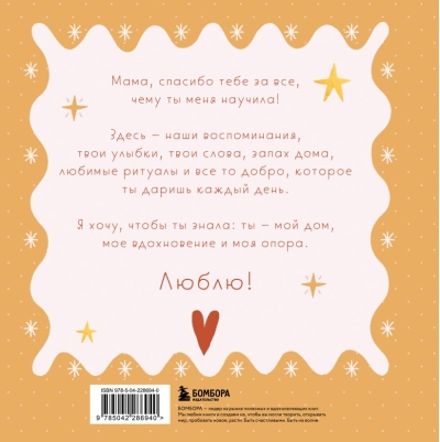 Šī nav tikai grāmata — tā ir vieta jūsu kopīgajam stāstam. Šeit nav iepriekš uzrakstīta teksta, jo galvenā varone ir tava mamma, bet autore — tu pats. 64 lappuses ir piepildītas ar jautājumiem, radošiem uzdevumiem un mājīgiem izklājumiem, kas palīdzēs tev pastāstīt viņai visu, kas parasti paliek nepateikts. Tu pastāstīsi mammai, kāpēc tu viņu mīli, kādas ir viņas superspējas un kādas ir tavas mīļākās atmiņas. Iekļausi savas iecienītākās fotogrāfijas, atceries smieklīgus stāstus un jokus, apraksti tradīcijas, receptes, dziesmas un sapņus. Vēstules, atzīšanās, fotogrāfijas no toreiz un tagad — tas viss kļūs par vērtīgu atgādinājumu par tuvību un atbalstu. Grāmata dzīvos un mainīsies, jo tu vari to papildināt pat pēc tam, kad būsi to viņai uzdāvinājusi.