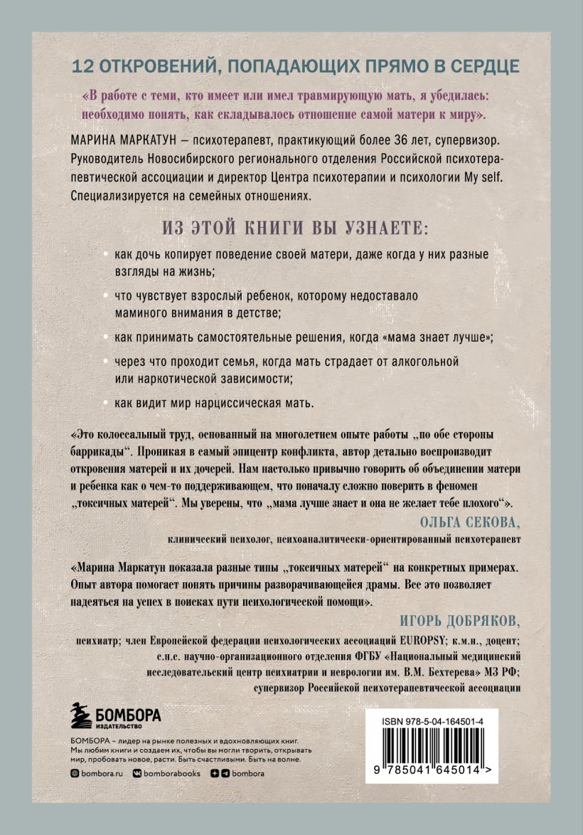 Elena lepojas ar to, ka ir māte un visu savu dzīvi veltījusi meitai. Viņas padoms vienmēr ir svarīgs viņas draudzenēm, taču kaut kādu iemeslu dēļ meita tam gluži nepiekrīt. Viņai ir tāds raksturs - viss viņas tēvs. Un patiesībā bērnībā bija pavisam cits bērns. Līda ir ļoti jūtīga un sāpīga personība. Taču viņai ir paveicies - meita vienmēr ir blakus. Pat tagad dzīvo uz tās pašas piestātnes. Lida nevar nervozēt: tiklīdz stress, tā uzreiz "ātrā palīdzība". Meita vienmēr par viņu uztraucas un visu pamet, kad mātei tas ir vajadzīgs. Zojas ģimenē viss ir atkarīgs no viņas. Meita ir precējusies un pati ir māte, bet kā viņu var atstāt bez kontroles? Kaut kas noteikti notiks nepareizi. Un ko vispār nozīmē atstāt meitu vienu pašu? Zoja ir māte! Cilvēki nāk un aiziet, bet meita ir uz visiem laikiem. Psihoterapeite Marina Markatun jau vairāk nekā 36 gadus savā kabinetā novēro sarežģītās mātes un meitas attiecības. Viņa ir pārliecinājusies, ka nepietiek ar personības raksturojumu un attiecību veida noteikšanu. Ir jāsaprot, kā māte redz pasauli un kā uz tiem pašiem notikumiem raugās meita. 12 mātes un viņu pieaugušās meitas stāsta savas dzīves stāstu. Katru stāstu papildina eksperta komentārs, kurā autore skaidro mātes uzvedību un sniedz savus ieteikumus konflikta risināšanai. Visi stāsti ir balstīti uz reāliem gadījumiem no prakses.