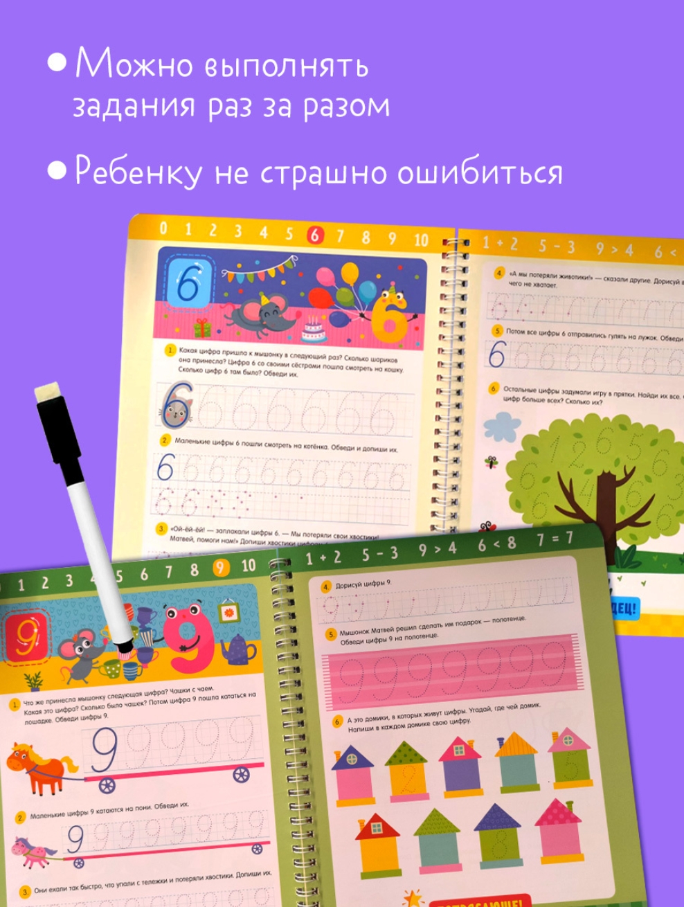 "Atkārtoti lietojamās burtnīcas. Skaitļi" ir jautra izglītojoša aktivitāte, lai sagatavotos skolai. Pateicoties marķierim, ko var viegli izdzēst ar dzēšgumiju uz vāciņa vai parastu salveti, vingrinājumus var veikt vairākas reizes un tie attīsta smalkās motorikas.