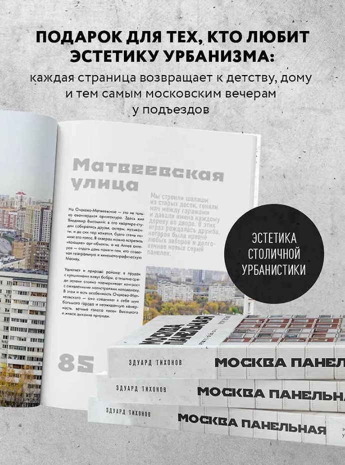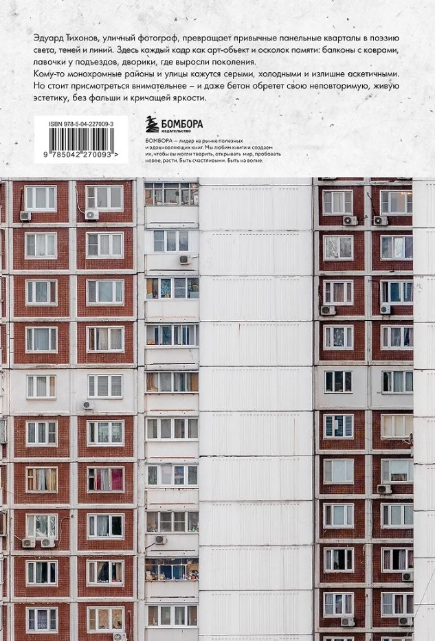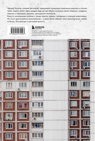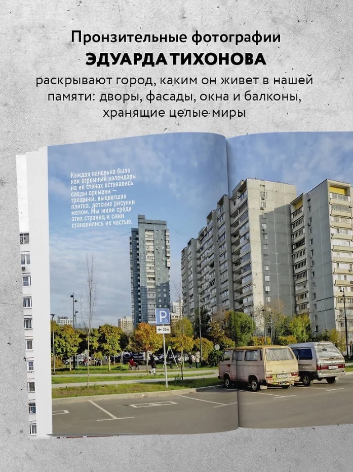 Tas, ko redzat savā priekšā, ir vairāk nekā fotoalbums. Tas ir mākslas objekts, kas pārveido pazīstamas paneļu ēku apkaimes betona un gaismas dzejā. Fotogrāfs Eduards Tihonovs ar retu jūtīgumu ir iemūžinājis tieši to arhitektūru, kas veidoja mūsu ikdienas pasauli: pelēkās fasādes, pagalmus, balkonus un ēku siluetus, kas ikvienam ir pazīstami no bērnības.