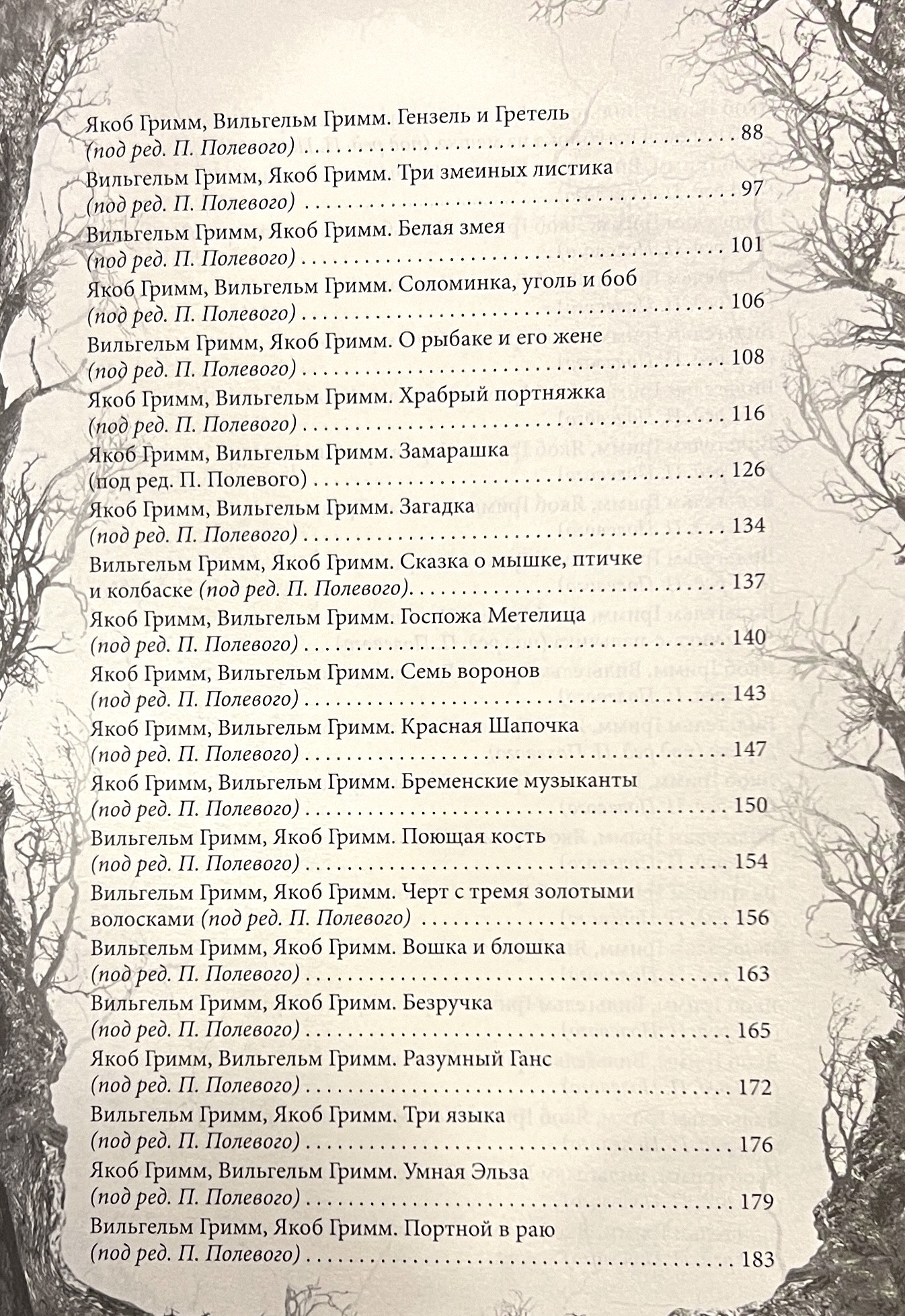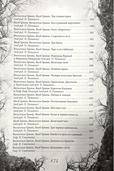 Daudzas slavenās pasakas oriģinālā nebeidzas laimīgi. Patiesībā brāļi Grimmi savus darbus rakstīja pieaugušajiem, tāpēc Pelnrušķītes, Sniegbaltītes un daudzu citu bērnu pasaku nepielāgoto versiju sižeti viegli varētu kļūt par mūsdienu šausmu filmas scenārija pamatu. Pelnrušķītes māsām tiek nogriezta daļa pēdas, lai tās varētu ietilpt kristāla kurpītē, princis pasakā par Rapunceli ar zariem izsit sev acis, bet "laipnie" vecāki Hansel un Gretel saviem bērniem nogriež rokas un kājas. Šādas pasakas jūs vēl nekad neesat lasījuši… Šis izdevums ir pirmais, kurā publicētas visas, ieskaitot tumšākās un biedējošākās pasakas no oriģinālā brāļu Grimmu krājuma: 200 pasakas un 10 leģendas. Lielformāta dāvanu izdevums papildināts ar klasiskajām F. Groth-Johann un R. Leinweber gravīrām. Unikāls iesējums ar šņorējumu, krāsotām malām, smags tonēts papīrs.