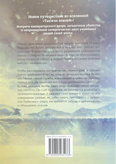 Lai izmeklētu šo ārkārtīgi sarežģīto lietu, Liugongas pilsētā ierodas Fens Sjao, Atklāto Zobenu Pils otrais meistars, slepenais dienests, kas tieši pakļauts imperatoram. Virkne noslēpumu noved viņu pie aizdomīgā daoista Cui Buqu, kurš it kā ir aizņemts ar sava nolaistā klostera atjaunošanu. Viņš ir vājas veselības stāvoklī, taču apveltīts ar izcilu prātu. Katram no viņiem ir savas cerības un plāni, abi ir pilnīgi atšķirīgi, taču, lai noskaidrotu, kas noticis ar Debesu ezera nefrītu, viņiem būs jāatmet malā savas domstarpības un jāapvieno spēki.