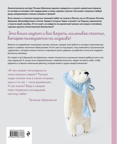 . Šī brīnišķīgās meistares Tatjanas Ševčenko grāmata iemācīs jums adīt mazu laimi, kas ietilpst plaukstā! Detalizēti soli pa solim aprakstītas meistarklases, kurās katrs darba posms ir ilustrēts un nodrošināts ar skaidru skaidrojumu. Un tagad no jūsu spieķu apakšas iznāk aizkustinošs "draugs", kuru var nēsāt somas kabatā, glabāt uz galda vai uzdāvināt mīļotajam cilvēkam. Tas var kļūt par brošu, atslēgu piekariņu, lielisku suvenīru. Taču visbiežāk šie apburošie "terapeitiskie" dzīvnieciņi tiek glabāti tāpēc, ka no tiem ir tik grūti šķirties.