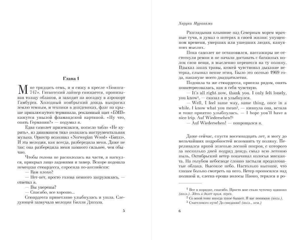 "Tiklīdz lidmašīna nolaidās, no skaļruņiem sāka klusi plūst instrumentālā mūzika. Orķestris spēlēja Bītlu dziesmu "Norvēģu mežs". Un šī melodija mani satrauca daudz vairāk nekā parasti... Es domāju par zaudējumiem savā dzīvē: zaudēto laiku, cilvēkiem, kas miruši un aizgājuši, domām, kas izzudušas."