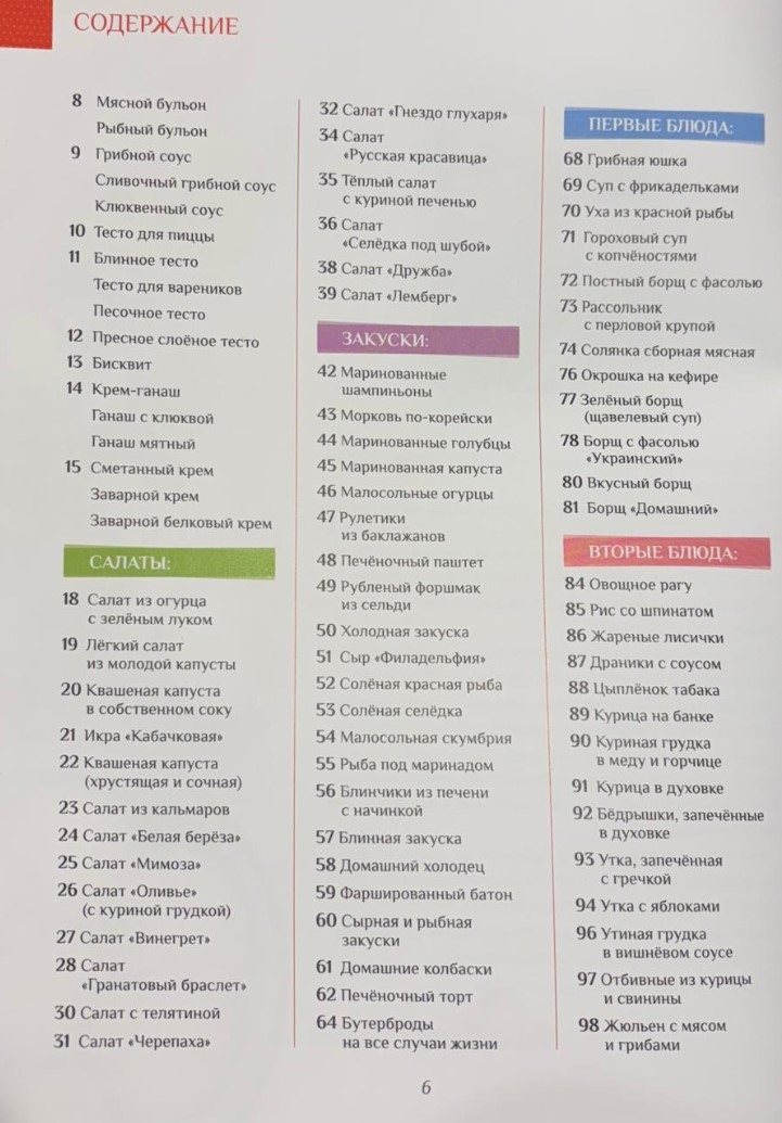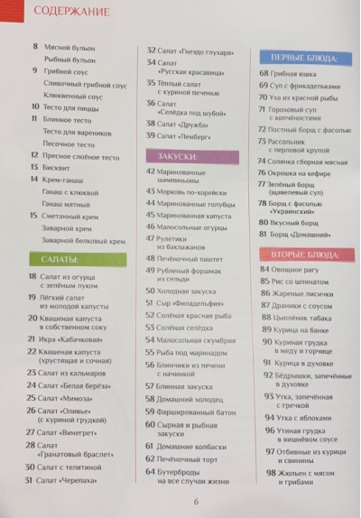 130 receptes, kas sadalītas kategorijās: salāti, uzkodas, pirmie ēdieni, pamatēdieni un cepumi.