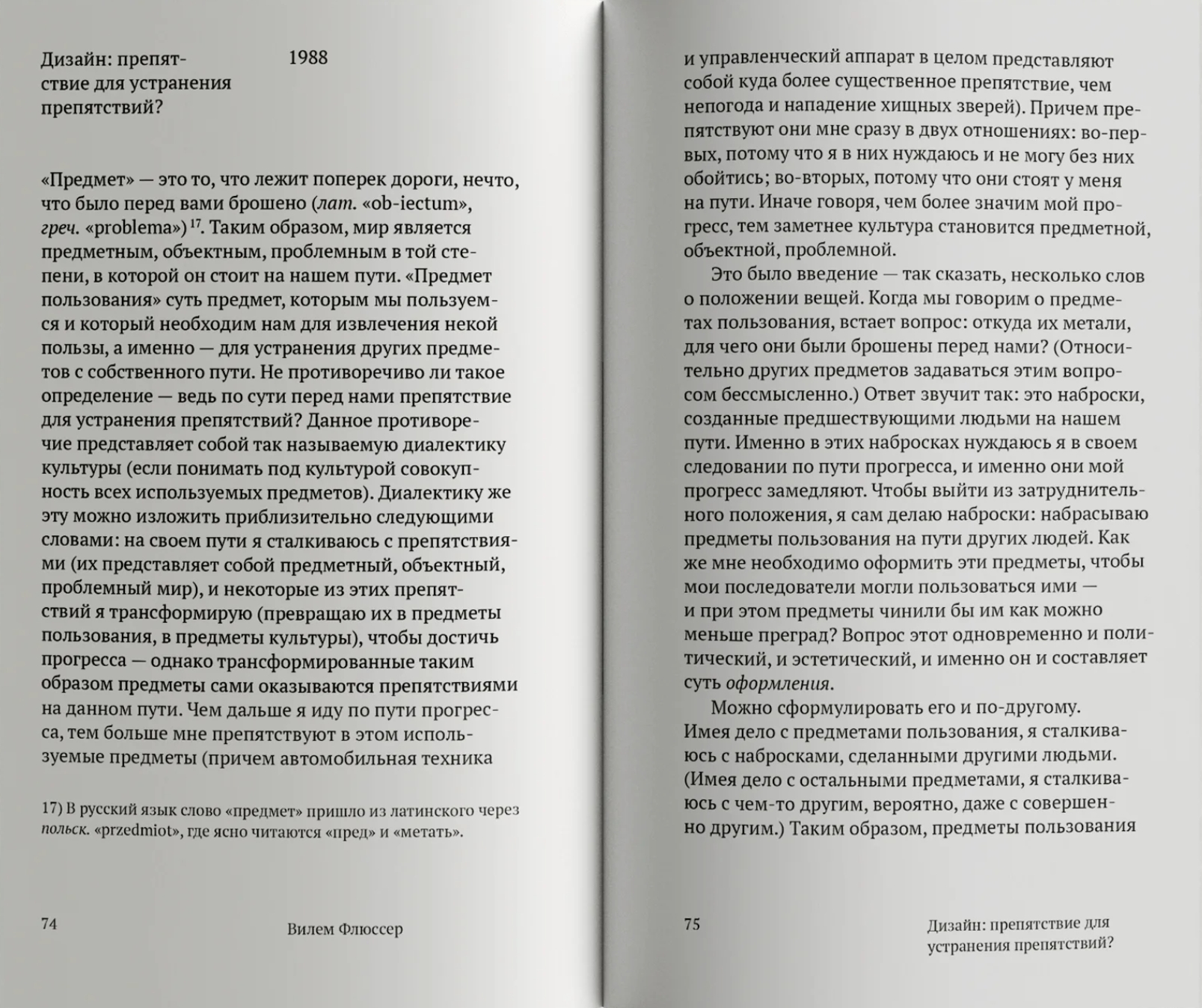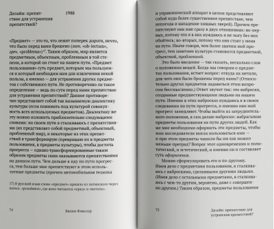 Vilēms Flsers (1920–1991), Valtera Bendžamina jaunākais laikabiedrs un viens no mediju studiju pionieriem, radīja neparastu intelektuālu žanru. Īsu un elegantu filozofisku eseju veidā viņš atklāj mūsu ikdienas pasaules semantiskās struktūras, tās svarīgākās jomas un tajās notiekošās transformācijas. Flsera analīze atklājas kā ikdienišķo objektu un mehānismu, kas mūs ieskauj, dizaina un pilsētplānošanas fenomenoloģija. Vienlaikus, saskaroties ar jaunā digitālā laikmeta iestāšanos, viņš atklāj, kā tīra digitālā forma arvien vairāk draud padarīt mūsu pasaules materialitāti par pagātni. Flsera paradoksālā domāšana apvieno viņa pieredzi par 20. gadsimta politiskajām katastrofām, ieskatu vēsturiskā skatījumā uz pagātni un izpratni par riskiem, ko jaunā civilizācija rada cilvēka brīvības nākotnei.