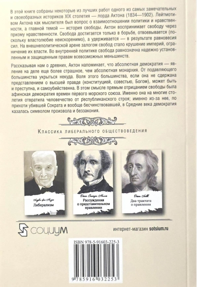 Šajā grāmatā ir apkopoti daži no izcilākajiem darbiem, ko sarakstījis viens no ievērojamākajiem un oriģinālākajiem 19. gadsimta vēsturniekiem, lords Aktons (1834–1902). Aktona kā domātāja vadmotīvs bija attiecības starp politiku un morāli, un viņa galvenā tēma bija brīvības vēsture. Aktons brīvību uztver caur morāles prizmu. Brīvība tiek sasniegta tikai ar cīņu, par to cīnoties (jo tieksme pēc varas ir neizskaužama) un to saglabājot ar spēku līdzsvaru. Ārpolitikā impēriju sabrukums un to varas ierobežošana kļuva par brīvības garantiju. Iekšpolitikā brīvība ir līdzvērtīga visu veidu minoritāšu droši nostiprinātām un aizsargātām tiesībām.