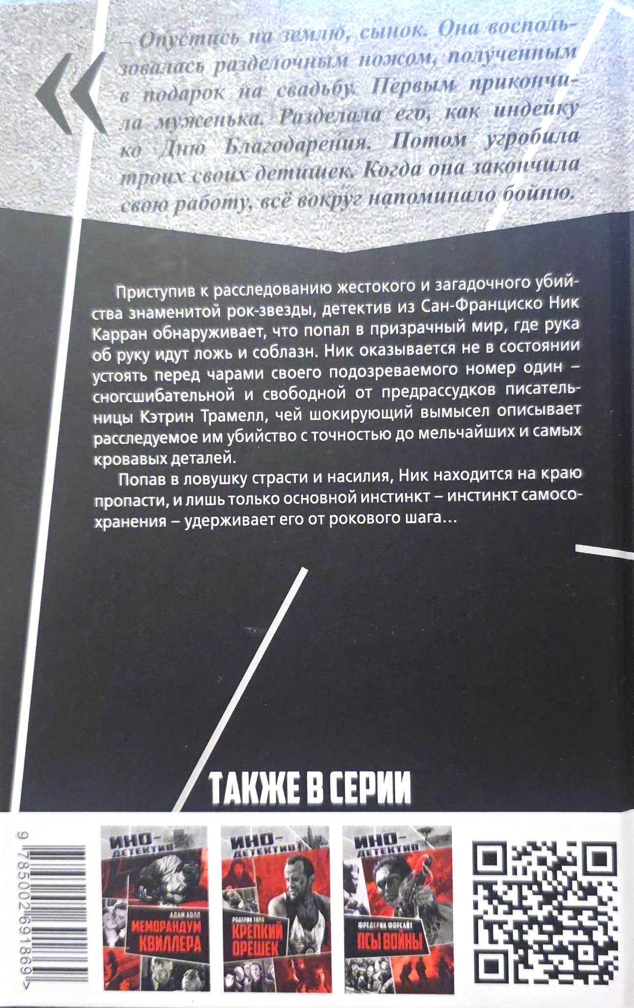 Pēc slavenas rokmūzikas zvaigznes brutālās un noslēpumainās slepkavības izmeklēšanas Sanfrancisko detektīvs Niks Kurans nonāk ēnu pasaulē, kur meli un pavedināšana pastāv līdzās. Niks nespēj pretoties sava galvenā aizdomās turamā valdzinājumam — satriecošās un netradicionālās rakstnieces Ketrīnas Tramelas —, kuras šokējošais daiļliteratūra apraksta slepkavību, kuru viņš izmeklē, līdz vissīkākajām, asiņainākajām detaļām. Ieslodzīts kaislību un vardarbības spirālē, Niks nonāk uz bezdibeņa robežas, un tikai viņa pamata instinkts — pašsaglabāšanās — attur viņu no šī liktenīgā soļa...